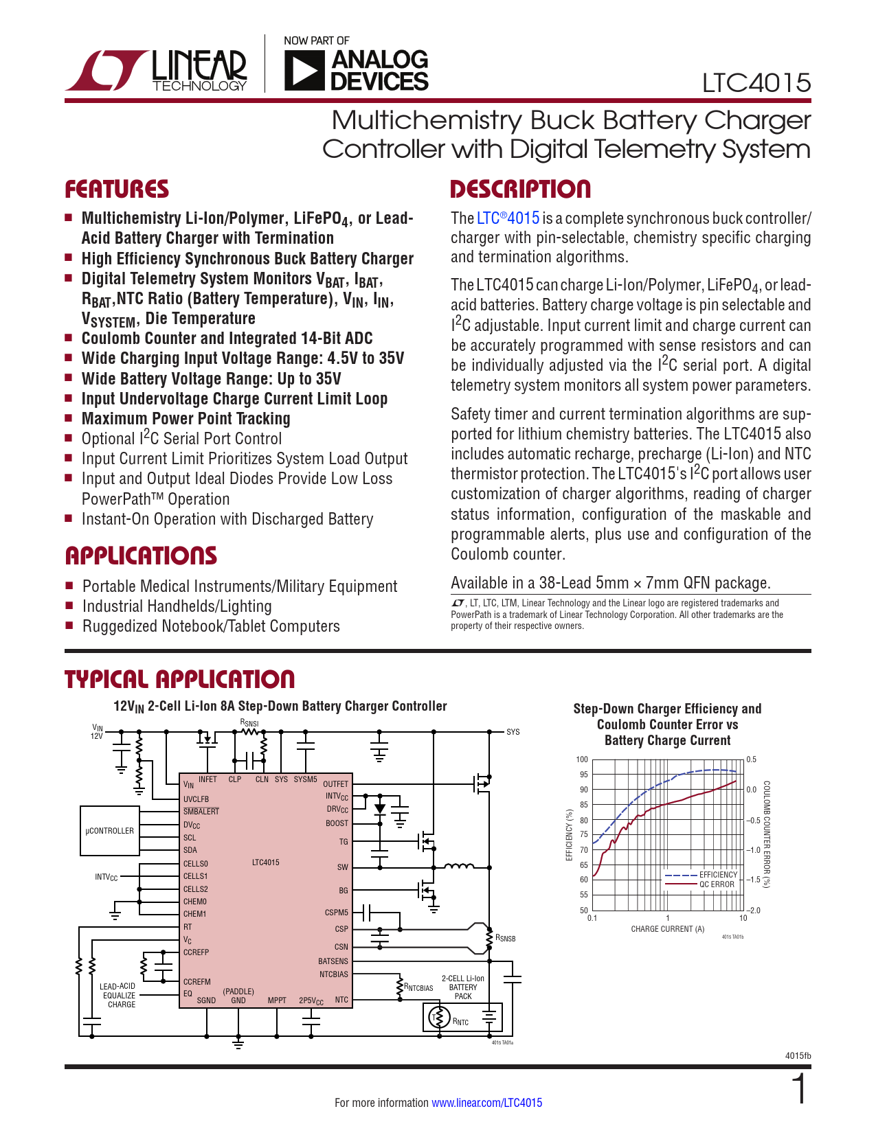 LTC4015 Multichemistry Buck Battery Charger Controller with Digital Telemetry System FEATURESDESCRIPTION n Multichemistry Li-Ion/Polymer, LiFePO4, or Lead- The LTC®4015 is a complete synchronous buck controller/ Acid Battery Charger with Termination charger with pin-selectable, chemistry specific charging n High Efficiency Synchronous Buck Battery Charger and termination algorithms. n Digital Telemetry System Monitors VBAT, IBAT, The LTC4015 can charge Li-Ion/Polymer, LiFePO R 4, or lead- BAT,NTC Ratio (Battery Temperature), VIN, IIN, acid batteries. Battery charge voltage is pin selectable and VSYSTEM, Die Temperature I2C adjustable. Input current limit and charge current can n Coulomb Counter and Integrated 14-Bit ADC be accurately programmed with sense resistors and can n Wide Charging Input Voltage Range: 4.5V to 35V be individually adjusted via the I2C serial port. A digital n Wide Battery Voltage Range: Up to 35V telemetry system monitors all system power parameters. n Input Undervoltage Charge Current Limit Loop Safety timer and current termination algorithms are sup- n Maximum Power Point Tracking ported for lithium chemistry batteries. The LTC4015 also n Optional I2C Serial Port Control includes automatic recharge, precharge (Li-Ion) and NTC n Input Current Limit Prioritizes System Load Output thermistor protection. The LTC4015's I2C port allows user n Input and Output Ideal Diodes Provide Low Loss PowerPath™ Operation customization of charger algorithms, reading of charger status information, configuration of the maskable and n Instant-On Operation with Discharged Battery programmable alerts, plus use and configuration of the APPLICATIONS Coulomb counter. n Portable Medical Instruments/Military Equipment Available in a 38-Lead 5mm × 7mm QFN package. L n , LT, LTC, LTM, Linear Technology and the Linear logo are registered trademarks and Industrial Handhelds/Lighting PowerPath is a trademark of Linear Technology Corporation. All other trademarks are the n property of their respective owners. Ruggedized Notebook/Tablet Computers TYPICAL APPLICATION12VIN 2-Cell Li-Ion 8A Step-Down Battery Charger ControllerStep-Down Charger Efficiency and R V SNSI IN Coulomb Counter Error vs 12V SYS Battery Charge Current 100 0.5 95 INFET CLP CLN SYS SYSM5 COULOMB COUNTER ERROR (%) VIN OUTFET 90 0.0 UVCLFB INTVCC 85 SMBALERT DRVCC 80 –0.5 DV BOOST µCONTROLLER CC 75 SCL TG SDA 70 –1.0 EFFICIENCY (%) CELLS0 LTC4015 65 SW INTVCC CELLS1 60 EFFICIENCY –1.5 QC ERROR CELLS2 BG 55 CHEM0 50 –2.0 CHEM1 CSPM5 0.1 1 10 RT CSP CHARGE CURRENT (A) 4015 TA01b V R C SNSB CSN CCREFP BATSENS NTCBIAS CCREFM 2-CELL Li-Ion LEAD-ACID RNTCBIAS BATTERY EQUALIZE EQ (PADDLE) SGND GND MPPT 2P5V NTC PACK CHARGE CC T RNTC 4015 TA01a 4015fb For more information www.linear.com/LTC4015 1 Document Outline Features Applications Typical Application Description Absolute Maximum Ratings Order Information Data Sheet Conventions Pin Configuration Electrical Characteristics Typical Performance Characteristics Pin Functions Block Diagram I2C Timing Diagram Operation Applications Information Register Description DETAILED Register Descriptions Typical Applications Package Description Revision History Typical Application Related Parts