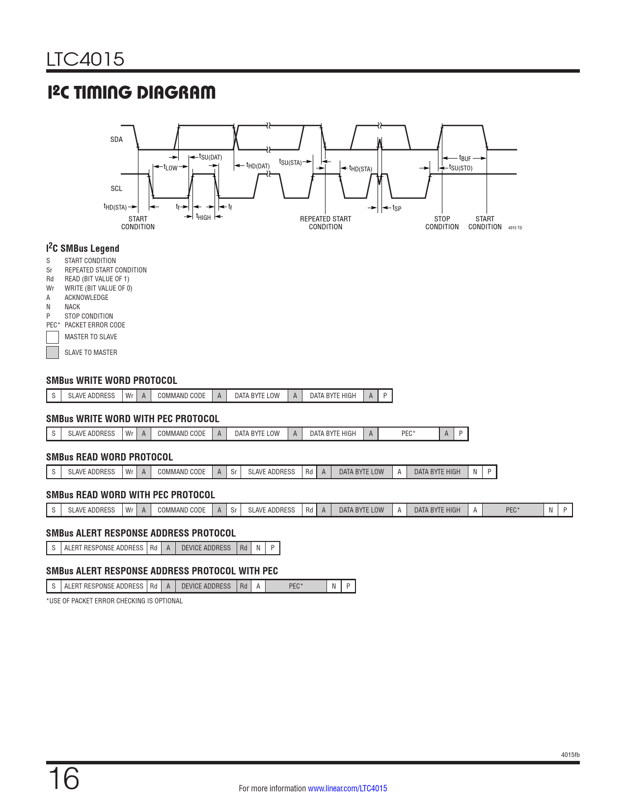 I2C TIMING DIAGRAM. I2C SMBus Legend. SMBus WRITE WORD PROTOCOL. SMBus WRITE WORD WITH PEC PROTOCOL. SMBus READ WORD PROTOCOL