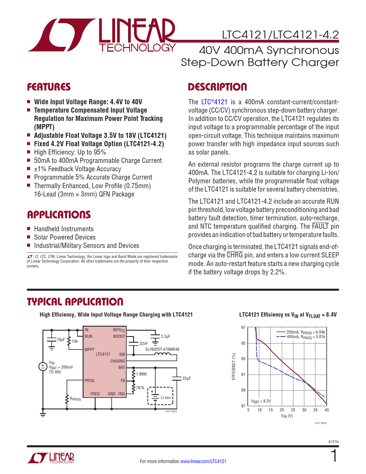 LTC4121/LTC4121-4.2 40V 400mA Synchronous Step-Down Battery Charger FEATURESDESCRIPTION n Wide Input Voltage Range: 4.4V to 40V The LTC®4121 is a 400mA constant-current/constant- n Temperature Compensated Input Voltage voltage (CC/CV) synchronous step-down battery charger. Regulation for Maximum Power Point Tracking In addition to CC/CV operation, the LTC4121 regulates its (MPPT) input voltage to a programmable percentage of the input n Adjustable Float Voltage 3.5V to 18V (LTC4121) open-circuit voltage. This technique maintains maximum n Fixed 4.2V Float Voltage Option (LTC4121-4.2) power transfer with high impedance input sources such n High Efficiency: Up to 95% as solar panels. n 50mA to 400mA Programmable Charge Current An external resistor programs the charge current up to n ±1% Feedback Voltage Accuracy 400mA. The LTC4121-4.2 is suitable for charging Li-Ion/ n Programmable 5% Accurate Charge Current Polymer batteries, while the programmable float voltage n Thermally Enhanced, Low Profile (0.75mm) of the LTC4121 is suitable for several battery chemistries. 16-Lead (3mm × 3mm) QFN Package The LTC4121 and LTC4121-4.2 include an accurate RUN pin threshold, low voltage battery preconditioning and bad APPLICATIONS battery fault detection, timer termination, auto-recharge, n and NTC temperature qualified charging. The FAULT pin Handheld Instruments n provides an indication of bad battery or temperature faults. Solar Powered Devices n Industrial/Military Sensors and Devices Once charging is terminated, the LTC4121 signals end-of- L, LT, LTC, LTM, Linear Technology, the Linear logo and Burst Mode are registered trademarks charge via the CHRG pin, and enters a low current SLEEP of Linear Technology Corporation. All other trademarks are the property of their respective owners. mode. An auto-restart feature starts a new charging cycle if the battery voltage drops by 2.2%. TYPICAL APPLICATIONHigh Efficiency, Wide Input Voltage Range Charging with LTC4121LTC4121 Efficiency vs VIN at VFLOAT = 8.4V IN INTV 97 CC 200mA, RPROG = 6.04k RUN BOOST 2.2µF 400mA, R 10µF PROG = 3.01k 10k 22nF 95 MPPT SLF6025T-470MR48 LTC4121 SW CHGSNS 93 VIN + V – BAT + 200mV BAT TO 40V 1.96M 91 PROG FB 22µF EFFICIENCY (%) 787k + 89 FREQ GND FBG RPROG Li-Ion VBAT = 8.3V 87 4121 TA01a 5 10 15 20 25 30 35 40 VIN (V) 4121 TA01b 4121fc For more information www.linear.com/LTC4121 1 Document Outline Features Applications Typical Application Description Absolute Maximum Ratings Pin Configuration Order Information Electrical Characteristics Typical Performance Characteristics Pin Functions Block Diagram Operation Applications Information Applications Examples Package Description Typical Application Related Parts
