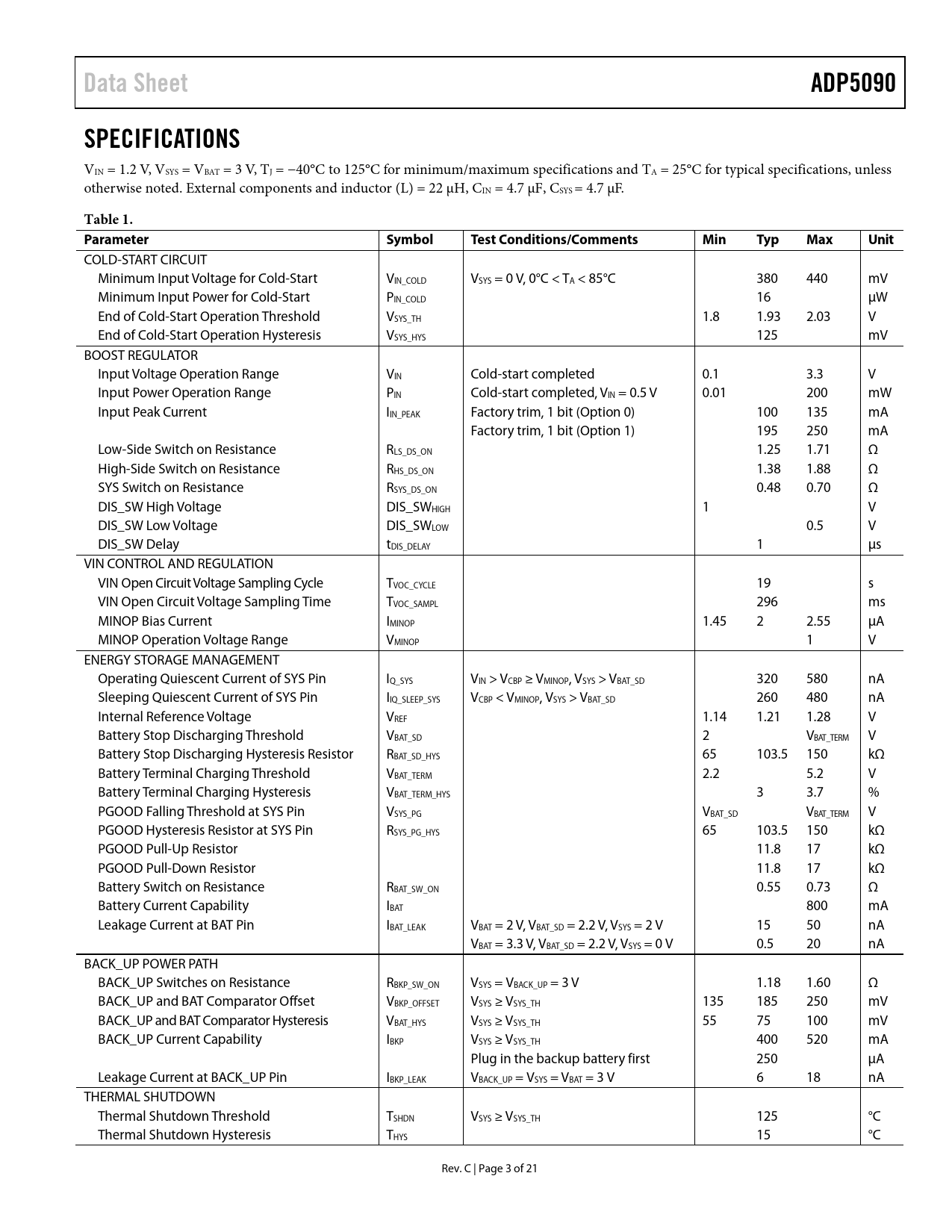 Data Sheet. ADP5090. SPECIFICATIONS. Table 1. Parameter. Symbol. Test Conditions/Comments. Min. Typ. Max. Unit
