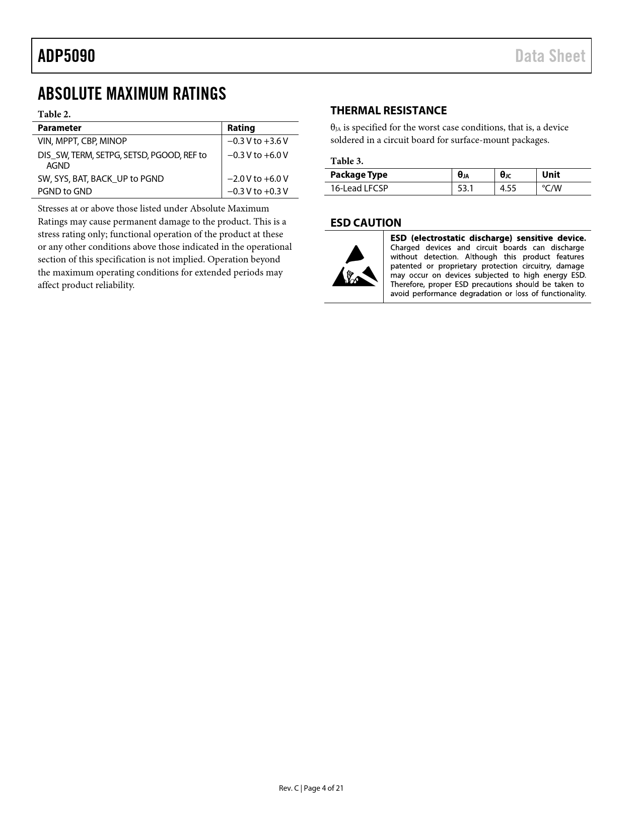 ADP5090Data SheetABSOLUTE MAXIMUM RATINGS Table 2.THERMAL RESISTANCEParameterRating θJA is specified for the worst case conditions, that is, a device VIN, MPPT, CBP, MINOP −0.3 V to +3.6 V soldered in a circuit board for surface-mount packages. DIS_SW, TERM, SETPG, SETSD, PGOOD, REF to −0.3 V to +6.0 V AGND Table 3. SW, SYS, BAT, BACK_UP to PGND −2.0 V to +6.0 V Package TypeθJAθJCUnit PGND to GND −0.3 V to +0.3 V 16-Lead LFCSP 53.1 4.55 °C/W Stresses at or above those listed under Absolute Maximum Ratings may cause permanent damage to the product. This is a ESD CAUTION stress rating only; functional operation of the product at these or any other conditions above those indicated in the operational section of this specification is not implied. Operation beyond the maximum operating conditions for extended periods may affect product reliability. Rev. C | Page 4 of 21 Document Outline FEATURES APPLICATIONS GENERAL DESCRIPTION TYPICAL APPLICATION CIRCUIT TABLE OF CONTENTS REVISION HISTORY SPECIFICATIONS ABSOLUTE MAXIMUM RATINGS THERMAL RESISTANCE ESD CAUTION PIN CONFIGURATION AND FUNCTION DESCRIPTIONS TYPICAL PERFORMANCE CHARACTERISTICS DETAILED FUNCTIONAL BLOCK DIAGRAM THEORY OF OPERATION COLD STARTUP (VSYS < VSYS_TH, VIN > VIN_COLD) BOOST REGULATOR (VBAT_TERM > VSYS ≥ VSYS_TH) VIN OPEN CIRCUIT AND MPPT ENERGY STORAGE CHARGE MANAGEMENT BACKUP STORAGE PATH MINOP FUNCTION DISABLING BOOST BATTERY OVERCHARGING PROTECTION BATTERY DISCHARGING PROTECTION POWER GOOD (PGOOD) POWER PATH WORKING FLOW CURRENT-LIMIT AND SHORT-CIRCUIT PROTECTION THERMAL SHUTDOWN APPLICATIONS INFORMATION ENERGY HARVESTER SELECTION ENERGY STORAGE ELEMENT SELECTION INDUCTOR SELECTION CAPACITOR SELECTION Input Capacitor SYS Capacitor CBP Capacitor LAYOUT AND ASSEMBLY CONSIDERATIONS TYPICAL APPLICATION CIRCUITS FACTORY PROGRAMMABLE OPTIONS OUTLINE DIMENSIONS ORDERING GUIDE