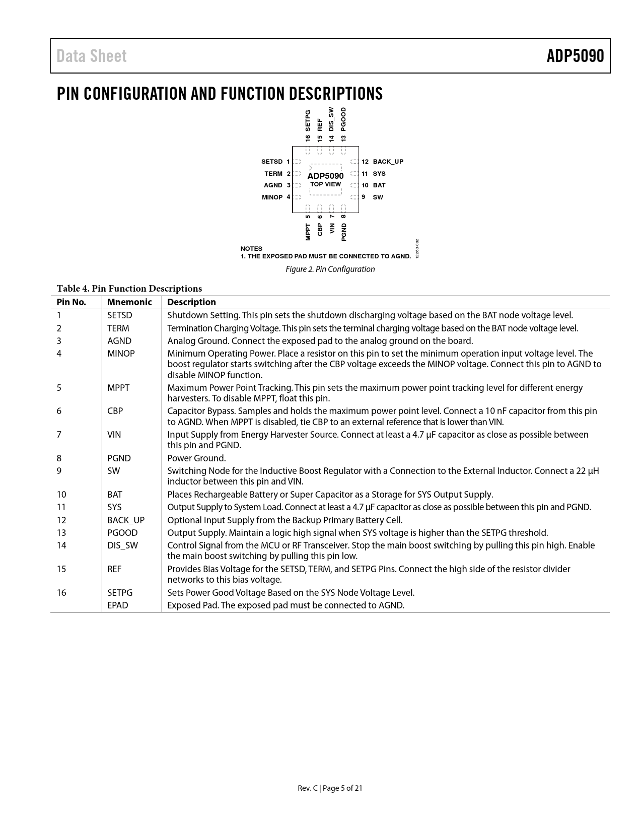 Data Sheet. ADP5090. PIN CONFIGURATION AND FUNCTION DESCRIPTIONS. GOOD. SET. SETSD 1. 12 BACK_UP. TERM 2. 11 SYS. AGND 3. TOP VIEW. 10 BAT