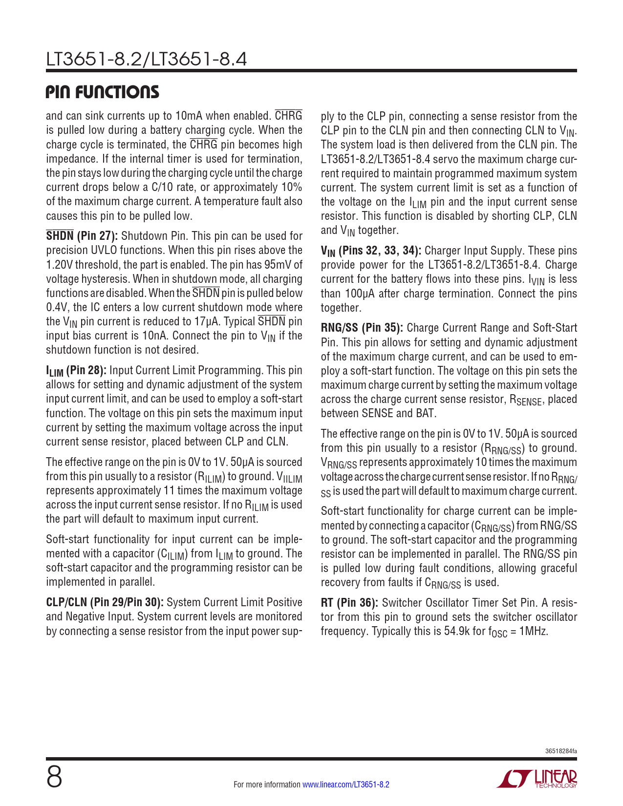 LT3651-8.2/LT3651-8.4 PIN FUNCTIONS and can sink currents up to 10mA when enabled. CHRG ply to the CLP pin, connecting a sense resistor from the is pulled low during a battery charging cycle. When the CLP pin to the CLN pin and then connecting CLN to VIN. charge cycle is terminated, the CHRG pin becomes high The system load is then delivered from the CLN pin. The impedance. If the internal timer is used for termination, LT3651-8.2/LT3651-8.4 servo the maximum charge cur- the pin stays low during the charging cycle until the charge rent required to maintain programmed maximum system current drops below a C/10 rate, or approximately 10% current. The system current limit is set as a function of of the maximum charge current. A temperature fault also the voltage on the ILIM pin and the input current sense causes this pin to be pulled low. resistor. This function is disabled by shorting CLP, CLN SHDN (Pin 27): Shutdown Pin. This pin can be used for and VIN together. precision UVLO functions. When this pin rises above the VIN (Pins 32, 33, 34): Charger Input Supply. These pins 1.20V threshold, the part is enabled. The pin has 95mV of provide power for the LT3651-8.2/LT3651-8.4. Charge voltage hysteresis. When in shutdown mode, all charging current for the battery flows into these pins. IVIN is less functions are disabled. When the SHDN pin is pulled below than 100µA after charge termination. Connect the pins 0.4V, the IC enters a low current shutdown mode where together. the VIN pin current is reduced to 17µA. Typical SHDN pin RNG/SS (Pin 35): Charge Current Range and Soft-Start input bias current is 10nA. Connect the pin to VIN if the Pin. This pin allows for setting and dynamic adjustment shutdown function is not desired. of the maximum charge current, and can be used to em- ILIM (Pin 28): Input Current Limit Programming. This pin ploy a soft-start function. The voltage on this pin sets the allows for setting and dynamic adjustment of the system maximum charge current by setting the maximum voltage input current limit, and can be used to employ a soft-start across the charge current sense resistor, RSENSE , placed function. The voltage on this pin sets the maximum input between SENSE and BAT. current by setting the maximum voltage across the input The effective range on the pin is 0V to 1V. 50µA is sourced current sense resistor, placed between CLP and CLN. from this pin usually to a resistor (RRNG/SS) to ground. The effective range on the pin is 0V to 1V. 50µA is sourced VRNG/SS represents approximately 10 times the maximum from this pin usually to a resistor (RILIM) to ground. VIILIM voltage across the charge current sense resistor. If no RRNG/ represents approximately 11 times the maximum voltage SS is used the part will default to maximum charge current. across the input current sense resistor. If no RILIM is used Soft-start functionality for charge current can be imple- the part will default to maximum input current. mented by connecting a capacitor (CRNG/SS) from RNG/SS Soft-start functionality for input current can be imple- to ground. The soft-start capacitor and the programming mented with a capacitor (CILIM) from ILIM to ground. The resistor can be implemented in parallel. The RNG/SS pin soft-start capacitor and the programming resistor can be is pulled low during fault conditions, allowing graceful implemented in parallel. recovery from faults if CRNG/SS is used. CLP/CLN (Pin 29/Pin 30): System Current Limit Positive RT (Pin 36): Switcher Oscillator Timer Set Pin. A resis- and Negative Input. System current levels are monitored tor from this pin to ground sets the switcher oscillator by connecting a sense resistor from the input power sup- frequency. Typically this is 54.9k for fOSC = 1MHz. 36518284fa 8 For more information www.linear.com/LT3651-8.2 Document Outline Features Applications Description Typical Application Absolute Maximum Ratings Pin Configuration Order Information Electrical Characteristics Typical Performance Characteristics Pin Functions Block Diagram Operation Applications Information Typical Applications Typical Application Related Parts
