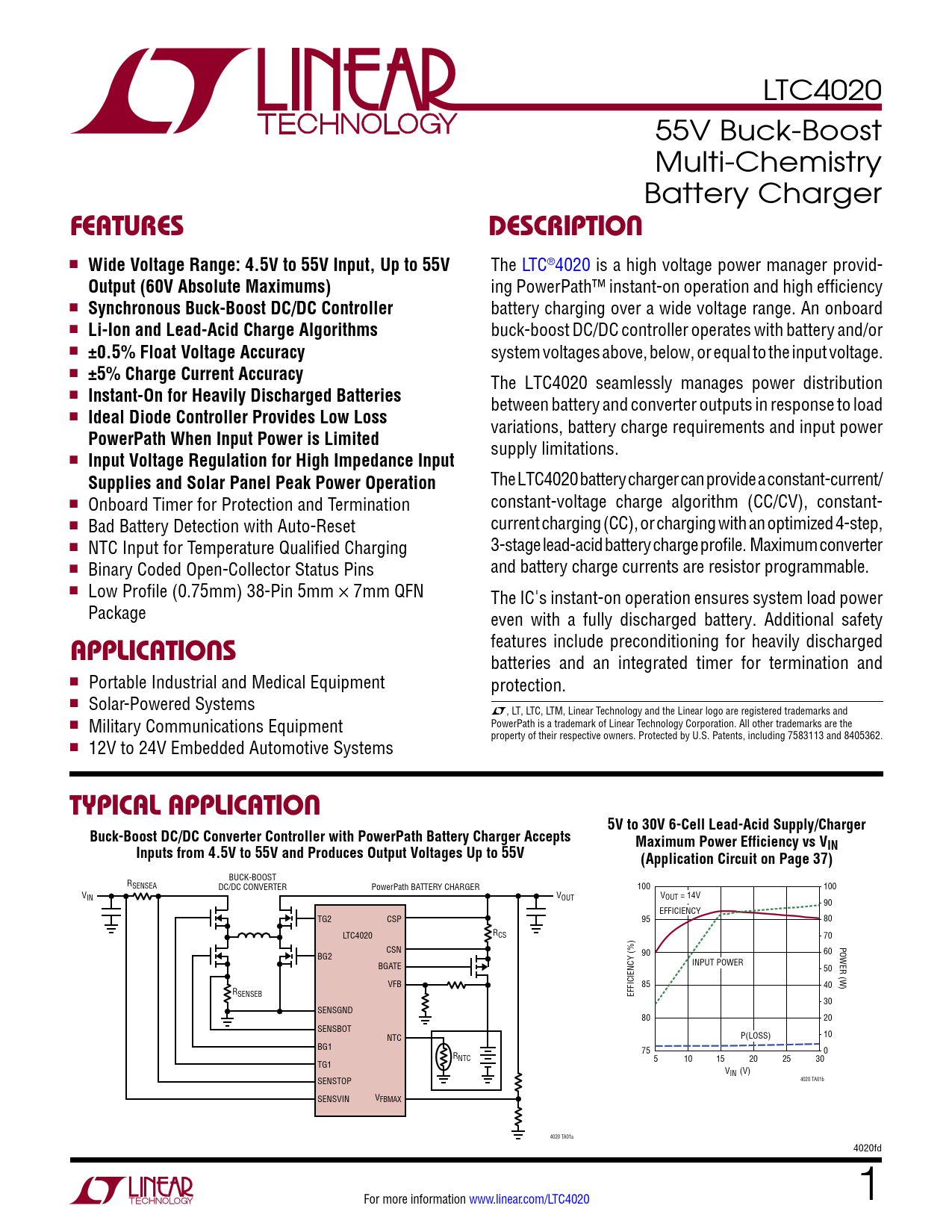 Typical applicaTion 5V to 30V 6-Cell Lead-Acid Supply/Charger Buck-Boost DC/DC Converter Controller with PowerPath Battery Charger Accepts Maximum Power Efficiency vs V Inputs from 4.5V to 55V and Produces Output Voltages Up to 55V IN (Application Circuit on Page 37)