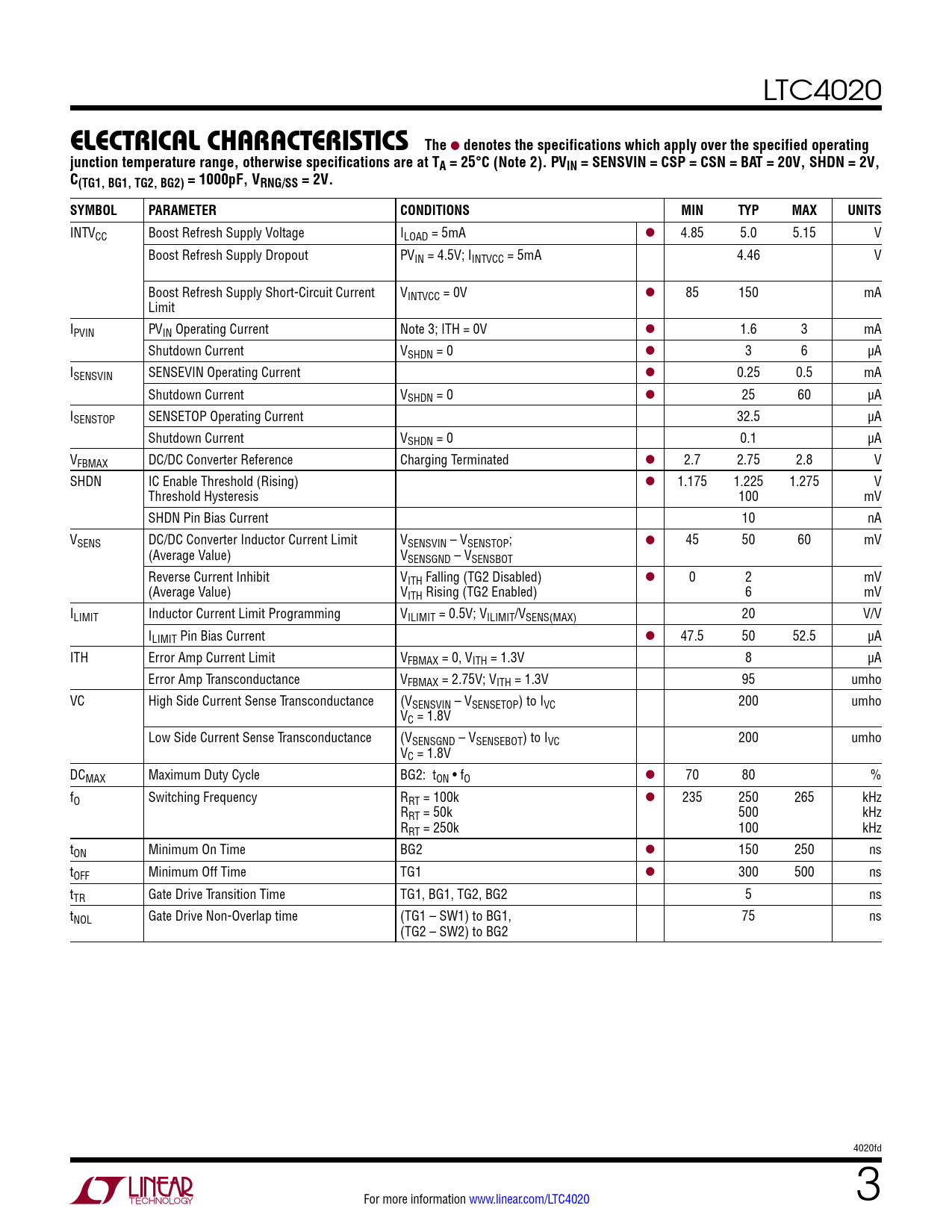 INTVCC Boost Refresh Supply Voltage ILOAD = 5mA l 4.85 5.0 5.15 V Boost Refresh Supply Dropout PVIN = 4.5V; IINTVCC = 5mA 4.46 V Boost Refresh Supply Short-Circuit Current VINTVCC = 0V l 85 150 mA Limit IPVIN PVIN Operating Current Note 3; ITH = 0V l 1.6 3 mA Shutdown Current VSHDN = 0 l 3 6 µA ISENSVIN SENSEVIN Operating Current l 0.25 0.5 mA Shutdown Current VSHDN = 0 l 25 60 µA ISENSTOP SENSETOP Operating Current 32.5 µA Shutdown Current VSHDN = 0 0.1 µA VFBMAX DC/DC Converter Reference Charging Terminated l 2.7 2.75 2.8 V SHDN IC Enable Threshold (Rising) l 1.175 1.225 1.275 V Threshold Hysteresis 100 mV SHDN Pin Bias Current 10 nA VSENS DC/DC Converter Inductor Current Limit VSENSVIN – VSENSTOP; l 45 50 60 mV (Average Value) VSENSGND – VSENSBOT Reverse Current Inhibit VITH Falling (TG2 Disabled) l 0 2 mV (Average Value) VITH Rising (TG2 Enabled) 6 mV ILIMIT Inductor Current Limit Programming VILIMIT = 0.5V; VILIMIT/VSENS(MAX) 20 V/V ILIMIT Pin Bias Current l 47.5 50 52.5 µA ITH Error Amp Current Limit VFBMAX = 0, VITH = 1.3V 8 µA Error Amp Transconductance VFBMAX = 2.75V; VITH = 1.3V 95 umho VC High Side Current Sense Transconductance (VSENSVIN – VSENSETOP) to IVC 200 umho VC = 1.8V Low Side Current Sense Transconductance (VSENSGND – VSENSEBOT) to IVC 200 umho VC = 1.8V DCMAX Maximum Duty Cycle BG2: tON • fO l 70 80 % fO Switching Frequency RRT = 100k l 235 250 265 kHz RRT = 50k 500 kHz RRT = 250k 100 kHz tON Minimum On Time BG2 l 150 250 ns tOFF Minimum Off Time TG1 l 300 500 ns tTR Gate Drive Transition Time TG1, BG1, TG2, BG2 5 ns tNOL Gate Drive Non-Overlap time (TG1 – SW1) to BG1, 75 ns (TG2 – SW2) to BG2 4020fd For more information www.linear.com/LTC4020 3 Document Outline Features Applications Typical Application Description Absolute Maximum Ratings Order Information Electrical Characteristics Pin Configuration Electrical Characteristics Pin Functions Block Diagram Operation Applications Information Package Description Revision History Typical Application Related Parts