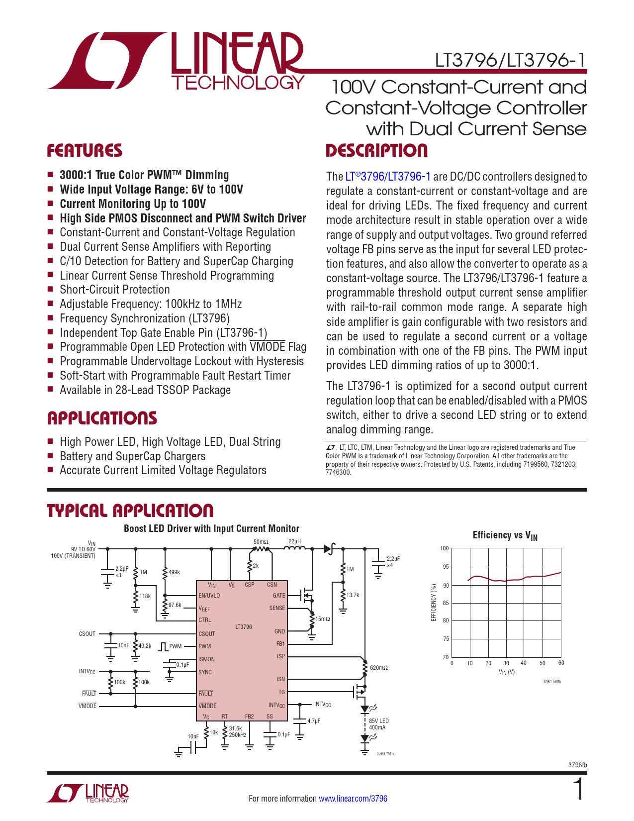 LT3796/LT3796-1 100V Constant-Current and Constant-Voltage Controller with Dual Current Sense FeaTuresDescripTion n 3000:1 True Color PWM™ Dimming The LT®3796/LT3796-1 are DC/DC controllers designed to n Wide Input Voltage Range: 6V to 100V regulate a constant-current or constant-voltage and are n Current Monitoring Up to 100V ideal for driving LEDs. The fixed frequency and current n High Side PMOS Disconnect and PWM Switch Driver mode architecture result in stable operation over a wide n Constant-Current and Constant-Voltage Regulation range of supply and output voltages. Two ground referred n Dual Current Sense Amplifiers with Reporting voltage FB pins serve as the input for several LED protec- n C/10 Detection for Battery and SuperCap Charging tion features, and also allow the converter to operate as a n Linear Current Sense Threshold Programming constant-voltage source. The LT3796/LT3796-1 feature a n Short-Circuit Protection programmable threshold output current sense amplifier n Adjustable Frequency: 100kHz to 1MHz with rail-to-rail common mode range. A separate high n Frequency Synchronization (LT3796) side amplifier is gain configurable with two resistors and n Independent Top Gate Enable Pin (LT3796-1) can be used to regulate a second current or a voltage n Programmable Open LED Protection with VMODE Flag in combination with one of the FB pins. The PWM input n Programmable Undervoltage Lockout with Hysteresis provides LED dimming ratios of up to 3000:1. n Soft-Start with Programmable Fault Restart Timer n The LT3796-1 is optimized for a second output current Available in 28-Lead TSSOP Package regulation loop that can be enabled/disabled with a PMOS switch, either to drive a second LED string or to extend applicaTions analog dimming range. n High Power LED, High Voltage LED, Dual String L, LT, LTC, LTM, Linear Technology and the Linear logo are registered trademarks and True n Battery and SuperCap Chargers Color PWM is a trademark of Linear Technology Corporation. All other trademarks are the property of their respective owners. Protected by U.S. Patents, including 7199560, 7321203, n Accurate Current Limited Voltage Regulators 7746300. Typical applicaTionBoost LED Driver with Input Current MonitorEfficiency vs VIN V 50mΩ 22µH IN 9V TO 60V 100 100V (TRANSIENT) 2.2µF 2k ×4 95 2.2µF 1M 499k 1M ×3 VIN VS CSP CSN 90 118k EN/UVLO GATE 13.7k 85 97.6k VREF SENSE CTRL 15mΩ EFFICIENCY (%) 80 LT3796 CSOUT CSOUT GND 75 10nF 40.2k PWM PWM FB1 ISP 70 ISMON 0 10 20 30 40 50 60 0.1µF 620mΩ INTVCC SYNC VIN (V) ISN 37961 TA01b 100k 100k FAULT FAULT TG VMODE VMODE INTVCC INTVCC VC RT FB2 SS 4.7µF 85V LED 31.6k 400mA 10k 10nF 250kHz 0.1µF 37961 TA01a 3796fb For more information www.linear.com/3796 1 Document Outline Features Applications Description Typical Application Absolute Maximum Ratings Pin Configuration Order Information Electrical Characteristics Typical Performance Characteristics Pin Functions Block Diagram Operation Applications Information Typical Applications Package Description Revision History Typical Application Related Parts