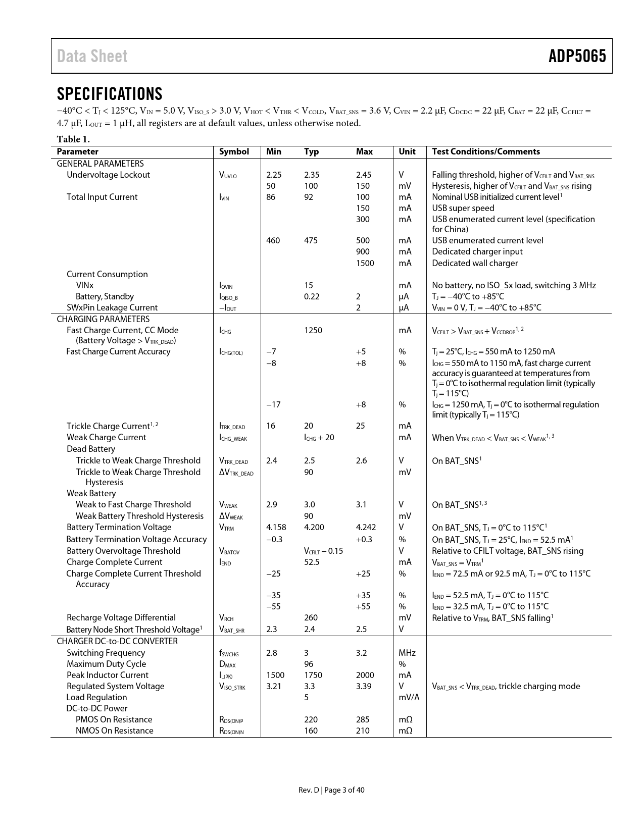 页数 / 页40 / 3 — Data Sheet. ADP5065. SPECIFICATIONS. Table 1. Parameter. Symbol. Min. …