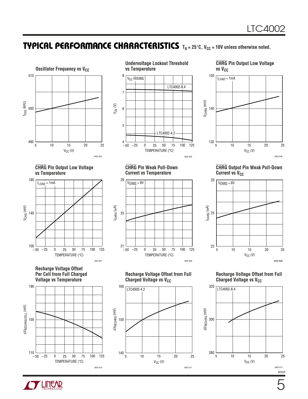 510 8 150 V I CC RISING LOAD = 1mA LTC4002-8.4 7 (V) (mV) (kHz) 500 6 140 UVV f OSC CHRGV 5 LTC4002-4.2 490 4 130 5 10 15 20 25 – 50 – 25 0 25 50 75 100 125 5 10 15 20 25 VCC (V) TEMPERATURE (°C) VCC (V) 4002 G04 4002 G05 4002 G06