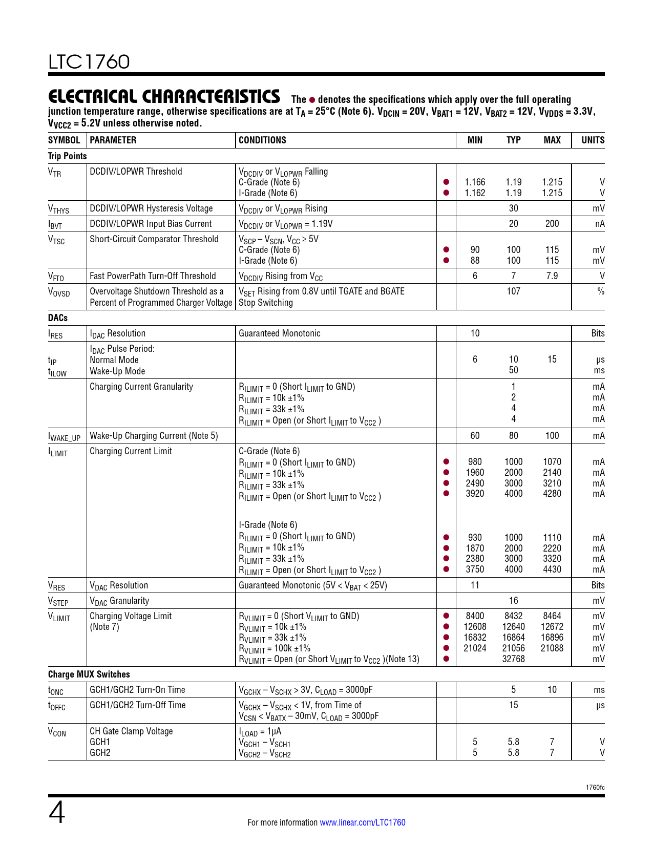 LTC1760 ELECTRICAL CHARACTERISTICSThe l denotes the specifications which apply over the full operatingjunction temperature range, otherwise specifications are at TA = 25°C (Note 6). VDCIN = 20V, VBAT1 = 12V, VBAT2 = 12V, VVDDS = 3.3V,VVCC2 = 5.2V unless otherwise noted. SYMBOL PARAMETERCONDITIONSMINTYPMAXUNITSTrip Points VTR DCDIV/LOPWR Threshold VDCDIV or VLOPWR Falling C-Grade (Note 6) l 1.166 1.19 1.215 V I-Grade (Note 6) l 1.162 1.19 1.215 V VTHYS DCDIV/LOPWR Hysteresis Voltage VDCDIV or VLOPWR Rising 30 mV IBVT DCDIV/LOPWR Input Bias Current VDCDIV or VLOPWR = 1.19V 20 200 nA VTSC Short-Circuit Comparator Threshold VSCP – VSCN, VCC ≥ 5V C-Grade (Note 6) l 90 100 115 mV I-Grade (Note 6) l 88 100 115 mV VFTO Fast PowerPath Turn-Off Threshold VDCDIV Rising from VCC 6 7 7.9 V VOVSD Overvoltage Shutdown Threshold as a VSET Rising from 0.8V until TGATE and BGATE 107 % Percent of Programmed Charger Voltage Stop Switching DACs IRES IDAC Resolution Guaranteed Monotonic 10 Bits IDAC Pulse Period: tIP Normal Mode 6 10 15 µs tILOW Wake-Up Mode 50 ms Charging Current Granularity RILIMIT = 0 (Short ILIMIT to GND) 1 mA RILIMIT = 10k ±1% 2 mA RILIMIT = 33k ±1% 4 mA RILIMIT = Open (or Short ILIMIT to VCC2 ) 4 mA IWAKE_UP Wake-Up Charging Current (Note 5) 60 80 100 mA ILIMIT Charging Current Limit C-Grade (Note 6) RILIMIT = 0 (Short ILIMIT to GND) l 980 1000 1070 mA RILIMIT = 10k ±1% l 1960 2000 2140 mA RILIMIT = 33k ±1% l 2490 3000 3210 mA R 3920 4000 4280 mA ILIMIT = Open (or Short ILIMIT to VCC2 ) l I-Grade (Note 6) RILIMIT = 0 (Short ILIMIT to GND) l 930 1000 1110 mA RILIMIT = 10k ±1% l 1870 2000 2220 mA RILIMIT = 33k ±1% l 2380 3000 3320 mA RILIMIT = Open (or Short ILIMIT to VCC2 ) l 3750 4000 4430 mA VRES VDAC Resolution Guaranteed Monotonic (5V < VBAT < 25V) 11 Bits VSTEP VDAC Granularity 16 mV VLIMIT Charging Voltage Limit RVLIMIT = 0 (Short VLIMIT to GND) l 8400 8432 8464 mV (Note 7) RVLIMIT = 10k ±1% l 12608 12640 12672 mV RVLIMIT = 33k ±1% l 16832 16864 16896 mV RVLIMIT = 100k ±1% l 21024 21056 21088 mV RVLIMIT = Open (or Short VLIMIT to VCC2 )(Note 13) l 32768 mV Charge MUX Switches tONC GCH1/GCH2 Turn-On Time VGCHX – VSCHX > 3V, CLOAD = 3000pF 5 10 ms tOFFC GCH1/GCH2 Turn-Off Time VGCHX – VSCHX < 1V, from Time of 15 µs VCSN < VBATX – 30mV, CLOAD = 3000pF VCON CH Gate Clamp Voltage ILOAD = 1µA GCH1 VGCH1 – VSCH1 5 5.8 7 V GCH2 VGCH2 – VSCH2 5 5.8 7 V 1760fc 4 For more information www.linear.com/LTC1760