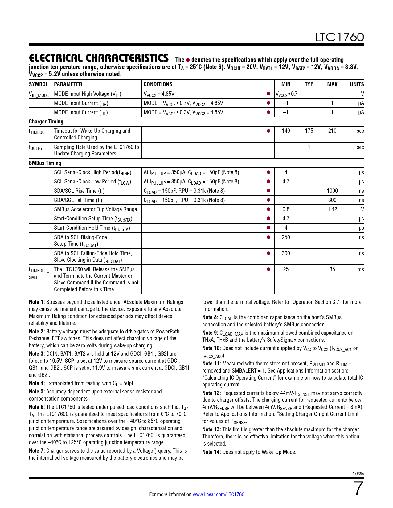 tTIMEOUT Timeout for Wake-Up Charging and l 140 175 210 sec Controlled Charging tQUERY Sampling Rate Used by the LTC1760 to 1 sec Update Charging Parameters