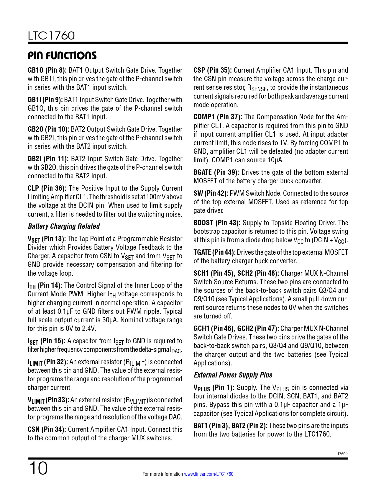 LTC1760 PIN FUNCTIONS GB1O (Pin 8): BAT1 Output Switch Gate Drive. Together CSP (Pin 35): Current Amplifier CA1 Input. This pin and with GB1I, this pin drives the gate of the P-channel switch the CSN pin measure the voltage across the charge cur- in series with the BAT1 input switch. rent sense resistor, RSENSE, to provide the instantaneous GB1I (Pin 9): BAT1 Input Switch Gate Drive. Together with current signals required for both peak and average current GB1O, this pin drives the gate of the P-channel switch mode operation. connected to the BAT1 input. COMP1 (Pin 37): The Compensation Node for the Am- GB2O (Pin 10): BAT2 Output Switch Gate Drive. Together plifier CL1. A capacitor is required from this pin to GND with GB2I, this pin drives the gate of the P-channel switch if input current amplifier CL1 is used. At input adapter in series with the BAT2 input switch. current limit, this node rises to 1V. By forcing COMP1 to GND, amplifier CL1 will be defeated (no adapter current GB2I (Pin 11): BAT2 Input Switch Gate Drive. Together limit). COMP1 can source 10µA. with GB2O, this pin drives the gate of the P-channel switch connected to the BAT2 input. BGATE (Pin 39): Drives the gate of the bottom external MOSFET of the battery charger buck converter. CLP (Pin 36): The Positive Input to the Supply Current Limiting Amplifier CL1. The threshold is set at 100mV above SW (Pin 42): PWM Switch Node. Connected to the source the voltage at the DCIN pin. When used to limit supply of the top external MOSFET. Used as reference for top current, a filter is needed to filter out the switching noise. gate driver. Battery Charging RelatedBOOST (Pin 43): Supply to Topside Floating Driver. The bootstrap capacitor is returned to this pin. Voltage swing VSET (Pin 13): The Tap Point of a Programmable Resistor at this pin is from a diode drop below VCC to (DCIN + VCC). Divider which Provides Battery Voltage Feedback to the Charger. A capacitor from CSN to V TGATE (Pin 44): Drives the gate of the top external MOSFET SET and from VSET to GND provide necessary compensation and filtering for of the battery charger buck converter. the voltage loop. SCH1 (Pin 45), SCH2 (Pin 48): Charger MUX N-Channel I Switch Source Returns. These two pins are connected to TH (Pin 14): The Control Signal of the Inner Loop of the Current Mode PWM. Higher I the sources of the back-to-back switch pairs Q3/Q4 and TH voltage corresponds to higher charging current in normal operation. A capacitor Q9/Q10 (see Typical Applications). A small pull-down cur- of at least 0.1µF to GND filters out PWM ripple. Typical rent source returns these nodes to 0V when the switches full-scale output current is 30µA. Nominal voltage range are turned off. for this pin is 0V to 2.4V. GCH1 (Pin 46), GCH2 (Pin 47): Charger MUX N-Channel I Switch Gate Drives. These two pins drive the gates of the SET (Pin 15): A capacitor from ISET to GND is required to filter higher frequency components from the delta-sigma I back-to-back switch pairs, Q3/Q4 and Q9/Q10, between DAC. the charger output and the two batteries (see Typical ILIMIT (Pin 32): An external resistor (RILIMIT) is connected Applications). between this pin and GND. The value of the external resis- tor programs the range and resolution of the programmed External Power Supply Pins charger current. VPLUS (Pin 1): Supply. The VPLUS pin is connected via V four internal diodes to the DCIN, SCN, BAT1, and BAT2 LIMIT (Pin 33): An external resistor (RVLIMIT)is connected between this pin and GND. The value of the external resis- pins. Bypass this pin with a 0.1µF capacitor and a 1µF tor programs the range and resolution of the voltage DAC. capacitor (see Typical Applications for complete circuit). CSN (Pin 34): Current Amplifier CA1 Input. Connect this BAT1 (Pin 3), BAT2 (Pin 2): These two pins are the inputs to the common output of the charger MUX switches. from the two batteries for power to the LTC1760. 1760fc 10 For more information www.linear.com/LTC1760