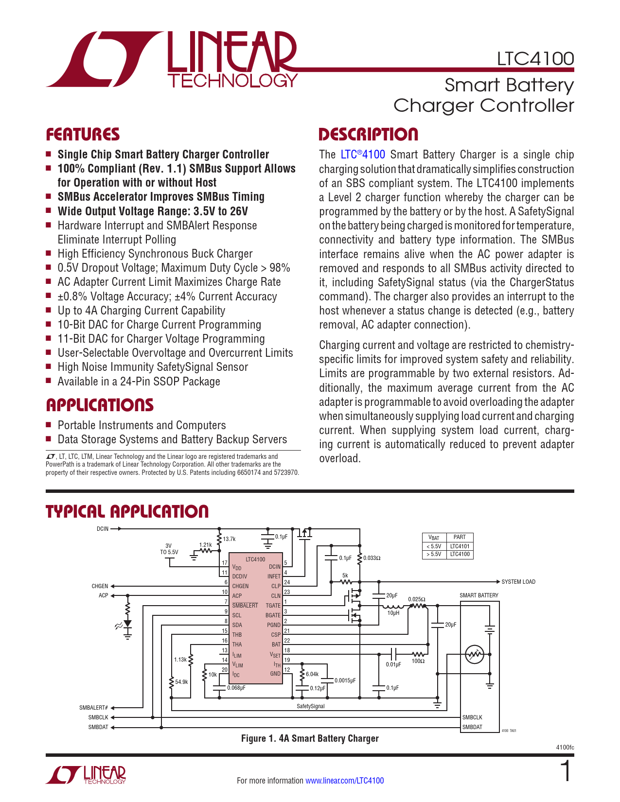 LTC4100 Smart Battery Charger Controller FeaTuresDescripTion n Single Chip Smart Battery Charger Controller The LTC®4100 Smart Battery Charger is a single chip n 100% Compliant (Rev. 1.1) SMBus Support Allows charging solution that dramatically simplifies construction for Operation with or without Host of an SBS compliant system. The LTC4100 implements n SMBus Accelerator Improves SMBus Timing a Level 2 charger function whereby the charger can be n Wide Output Voltage Range: 3.5V to 26V programmed by the battery or by the host. A SafetySignal n Hardware Interrupt and SMBAlert Response on the battery being charged is monitored for temperature, Eliminate Interrupt Polling connectivity and battery type information. The SMBus n High Efficiency Synchronous Buck Charger interface remains alive when the AC power adapter is n 0.5V Dropout Voltage; Maximum Duty Cycle > 98% removed and responds to all SMBus activity directed to n AC Adapter Current Limit Maximizes Charge Rate it, including SafetySignal status (via the ChargerStatus n ±0.8% Voltage Accuracy; ±4% Current Accuracy command). The charger also provides an interrupt to the n Up to 4A Charging Current Capability host whenever a status change is detected (e.g., battery n 10-Bit DAC for Charge Current Programming removal, AC adapter connection). n 11-Bit DAC for Charger Voltage Programming Charging current and voltage are restricted to chemistry- n User-Selectable Overvoltage and Overcurrent Limits specific limits for improved system safety and reliability. n High Noise Immunity SafetySignal Sensor Limits are programmable by two external resistors. Ad- n Available in a 24-Pin SSOP Package ditionally, the maximum average current from the AC adapter is programmable to avoid overloading the adapter applicaTions when simultaneously supplying load current and charging n Portable Instruments and Computers current. When supplying system load current, charg- n Data Storage Systems and Battery Backup Servers ing current is automatically reduced to prevent adapter L, LT, LTC, LTM, Linear Technology and the Linear logo are registered trademarks and overload. PowerPath is a trademark of Linear Technology Corporation. All other trademarks are the property of their respective owners. Protected by U.S. Patents including 6650174 and 5723970. Typical applicaTion DCIN 0.1µF 13.7k VBAT PART 3V 1.21k < 5.5V LTC4101 TO 5.5V 0.1µF > 5.5V LTC4100 0.033Ω 17 LTC4100 5 VDD DCIN 11 4 DCDIV INFET 5k 6 24 SYSTEM LOAD CHGEN CHGEN CLP 10 23 ACP ACP CLN 20µF SMART BATTERY 7 1 0.025Ω SMBALERT TGATE 9 3 10µH SCL BGATE 8 2 SDA PGND 20µF 15 21 THB CSP 16 22 THA BAT 13 18 ILIM VSET 1.13k 14 19 100Ω VLIM ITH 0.01µF 20 12 10k IDC GND 6.04k 54.9k 0.0015µF 0.068µF 0.12µF 0.1µF SMBALERT# SafetySignal SMBCLK SMBCLK SMBDAT SMBDAT 4100 TA01 Figure 1. 4A Smart Battery Charger 4100fc For more information www.linear.com/LTC4100 1