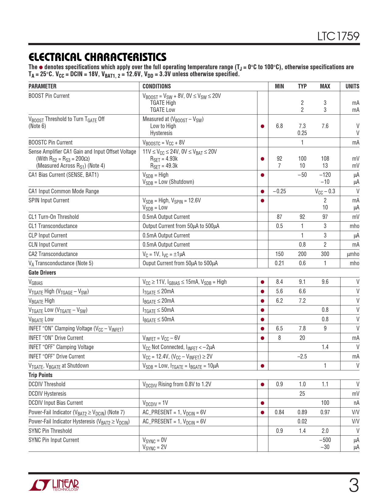 BOOST Pin Current VBOOST = VSW + 8V, 0V ≤ VSW ≤ 20V TGATE High 2 3 mA TGATE Low 2 3 mA VBOOST Threshold to Turn TGATE Off Measured at (VBOOST – VSW) (Note 6) Low to High ● 6.8 7.3 7.6 V Hysteresis 0.25 V BOOSTC Pin Current VBOOSTC = VCC + 8V 1 mA Sense Amplifier CA1 Gain and Input Offset Voltage 11V ≤ VCC ≤ 24V, 0V ≤ VBAT ≤ 20V (With RS2 = RS3 = 200Ω) RSET = 4.93k ● 92 100 108 mV (Measured Across RS1) (Note 4) RSET = 49.3k 7 10 13 mV CA1 Bias Current (SENSE, BAT1) VSDB = High ● – 50 –120 µA VSDB = Low (Shutdown) –10 µA CA1 Input Common Mode Range ● – 0.25 VCC – 0.3 V SPIN Input Current VSDB = High, VSPIN = 12.6V ● 2 mA VSDB = Low 10 µA CL1 Turn-On Threshold 0.5mA Output Current 87 92 97 mV CL1 Transconductance Output Current from 50µA to 500µA 0.5 1 3 mho CLP Input Current 0.5mA Output Current 1 3 µA CLN Input Current 0.5mA Output Current 0.8 2 mA CA2 Transconductance VC = 1V, IVC = ±1µA 150 200 300 µmho VA Transconductance (Note 5) Ouput Current from 50µA to 500µA 0.21 0.6 1 mho