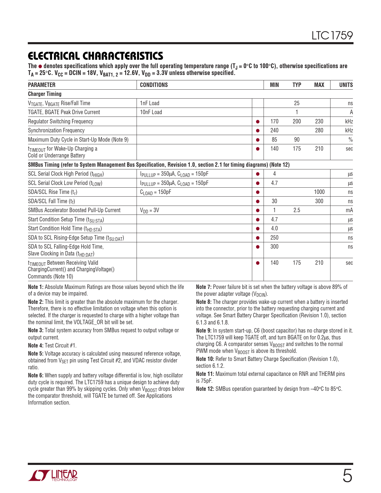 LTC1759 ELECTRICAL CHARACTERISTICSThe ● denotes specifications which apply over the full operating temperature range (TJ = 0 ° C to 100 ° C), otherwise specifications areTA = 25 ° C. VCC = DCIN = 18V, VBAT1, 2 = 12.6V, VDD = 3.3V unless otherwise specified.PARAMETERCONDITIONSMINTYPMAXUNITSCharger Timing VTGATE, VBGATE Rise/Fall Time 1nF Load 25 ns TGATE, BGATE Peak Drive Current 10nF Load 1 A Regulator Switching Frequency ● 170 200 230 kHz Synchronization Frequency ● 240 280 kHz Maximum Duty Cycle in Start-Up Mode (Note 9) ● 85 90 % tTIMEOUT for Wake-Up Charging a ● 140 175 210 sec Cold or Underrange Battery SMBus Timing (refer to System Management Bus Specification, Revision 1.0, section 2.1 for timing diagrams) (Note 12) SCL Serial Clock High Period (tHIGH) IPULLUP = 350µA, CLOAD = 150pF ● 4 µs SCL Serial Clock Low Period (tLOW) IPULLUP = 350µA, CLOAD = 150pF ● 4.7 µs SDA/SCL Rise Time (tr) CLOAD = 150pF ● 1000 ns SDA/SCL Fall Time (tf) ● 30 300 ns SMBus Accelerator Boosted Pull-Up Current VDD = 3V ● 1 2.5 mA Start Condition Setup Time (tSU:STA) ● 4.7 µs Start Condition Hold Time (tHD:STA) ● 4.0 µs SDA to SCL Rising-Edge Setup Time (tSU:DAT) ● 250 ns SDA to SCL Falling-Edge Hold Time, ● 300 ns Slave Clocking in Data (tHD:DAT) tTIMEOUT Between Receiving Valid ● 140 175 210 sec ChargingCurrent() and ChargingVoltage() Commands (Note 10) Note 1: Absolute Maximum Ratings are those values beyond which the life Note 7: Power failure bit is set when the battery voltage is above 89% of of a device may be impaired. the power adapter voltage (VDCIN). Note 2: This limit is greater than the absolute maximum for the charger. Note 8: The charger provides wake-up current when a battery is inserted Therefore, there is no effective limitation on voltage when this option is into the connector, prior to the battery requesting charging current and selected. If the charger is requested to charge with a higher voltage than voltage. See Smart Battery Charger Specification (Revision 1.0), section the nominal limit, the VOLTAGE_OR bit will be set. 6.1.3 and 6.1.8. Note 3: Total system accuracy from SMBus request to output voltage or Note 9: In system start-up, C6 (boost capacitor) has no charge stored in it. output current. The LTC1759 will keep TGATE off, and turn BGATE on for 0.2µs, thus Note 4: Test Circuit #1. charging C6. A comparator senses VBOOST and switches to the normal Note 5: Voltage accuracy is calculated using measured reference voltage, PWM mode when VBOOST is above its threshold. obtained from V Note 10: Refer to Smart Battery Charge Specification (Revision 1.0), SET pin using Test Circuit #2, and VDAC resistor divider ratio. section 6.1.2. Note 6: When supply and battery voltage differential is low, high oscillator Note 11: Maximum total external capacitance on RNR and THERM pins duty cycle is required. The LTC1759 has a unique design to achieve duty is 75pF. cycle greater than 99% by skipping cycles. Only when VBOOST drops below Note 12: SMBus operation guaranteed by design from –40°C to 85°C. the comparator threshold, will TGATE be turned off. See Applications Information section. 5