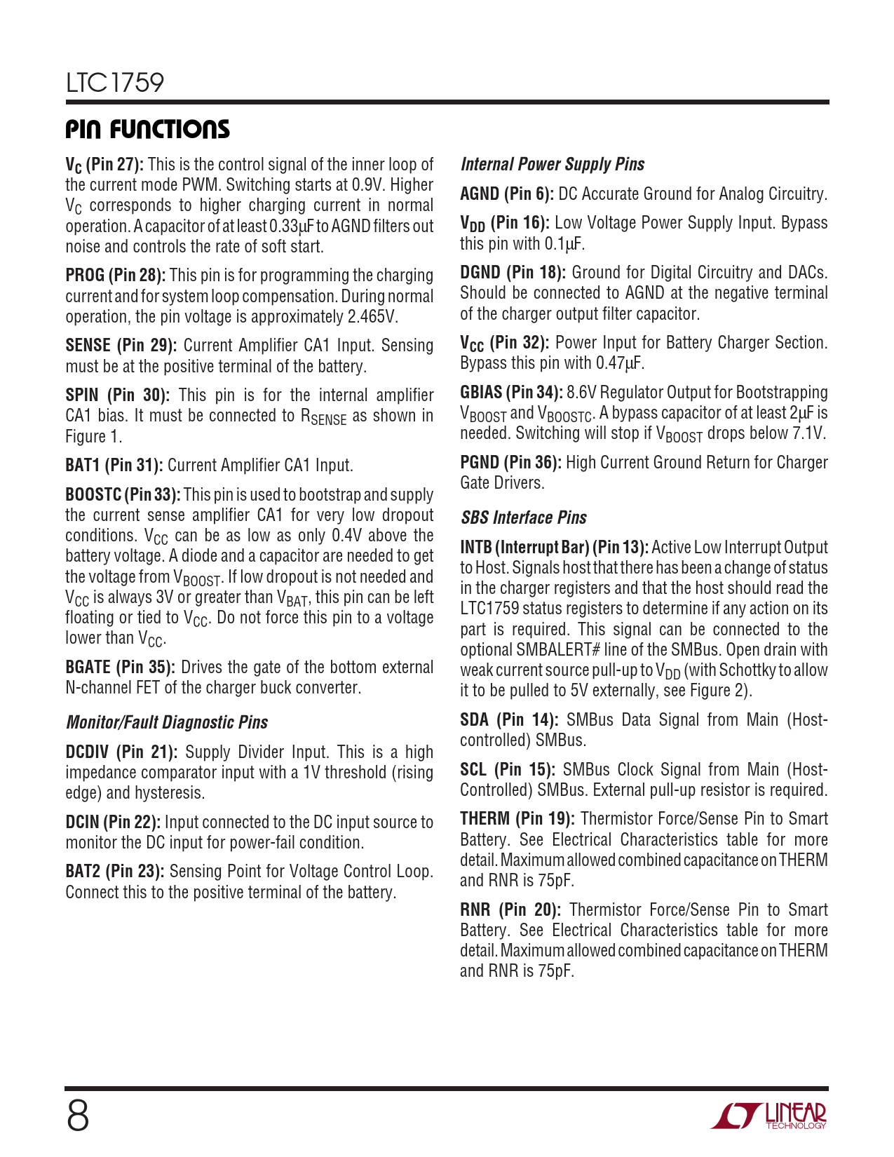 LTC1759 UUUPIN FUNCTIONSVC (Pin 27): This is the control signal of the inner loop of Internal Power Supply Pins the current mode PWM. Switching starts at 0.9V. Higher AGND (Pin 6): DC Accurate Ground for Analog Circuitry. VC corresponds to higher charging current in normal operation. A capacitor of at least 0.33µF to AGND filters out VDD (Pin 16): Low Voltage Power Supply Input. Bypass noise and controls the rate of soft start. this pin with 0.1µF. PROG (Pin 28): This pin is for programming the charging DGND (Pin 18): Ground for Digital Circuitry and DACs. current and for system loop compensation. During normal Should be connected to AGND at the negative terminal operation, the pin voltage is approximately 2.465V. of the charger output filter capacitor. SENSE (Pin 29): Current Amplifier CA1 Input. Sensing VCC (Pin 32): Power Input for Battery Charger Section. must be at the positive terminal of the battery. Bypass this pin with 0.47µF. SPIN (Pin 30): This pin is for the internal amplifier GBIAS (Pin 34): 8.6V Regulator Output for Bootstrapping CA1 bias. It must be connected to R V SENSE as shown in BOOST and VBOOSTC. A bypass capacitor of at least 2µF is Figure 1. needed. Switching will stop if VBOOST drops below 7.1V. BAT1 (Pin 31): Current Amplifier CA1 Input. PGND (Pin 36): High Current Ground Return for Charger Gate Drivers. BOOSTC (Pin 33): This pin is used to bootstrap and supply the current sense amplifier CA1 for very low dropout SBS Interface Pins conditions. VCC can be as low as only 0.4V above the INTB (Interrupt Bar) (Pin 13): Active Low Interrupt Output battery voltage. A diode and a capacitor are needed to get to Host. Signals host that there has been a change of status the voltage from VBOOST. If low dropout is not needed and in the charger registers and that the host should read the VCC is always 3V or greater than VBAT, this pin can be left LTC1759 status registers to determine if any action on its floating or tied to VCC. Do not force this pin to a voltage part is required. This signal can be connected to the lower than VCC. optional SMBALERT# line of the SMBus. Open drain with BGATE (Pin 35): Drives the gate of the bottom external weak current source pull-up to VDD (with Schottky to allow N-channel FET of the charger buck converter. it to be pulled to 5V externally, see Figure 2). Monitor/Fault Diagnostic PinsSDA (Pin 14): SMBus Data Signal from Main (Host- controlled) SMBus. DCDIV (Pin 21): Supply Divider Input. This is a high impedance comparator input with a 1V threshold (rising SCL (Pin 15): SMBus Clock Signal from Main (Host- edge) and hysteresis. Controlled) SMBus. External pull-up resistor is required. DCIN (Pin 22): Input connected to the DC input source to THERM (Pin 19): Thermistor Force/Sense Pin to Smart monitor the DC input for power-fail condition. Battery. See Electrical Characteristics table for more detail. Maximum allowed combined capacitance on THERM BAT2 (Pin 23): Sensing Point for Voltage Control Loop. and RNR is 75pF. Connect this to the positive terminal of the battery. RNR (Pin 20): Thermistor Force/Sense Pin to Smart Battery. See Electrical Characteristics table for more detail. Maximum allowed combined capacitance on THERM and RNR is 75pF. 8