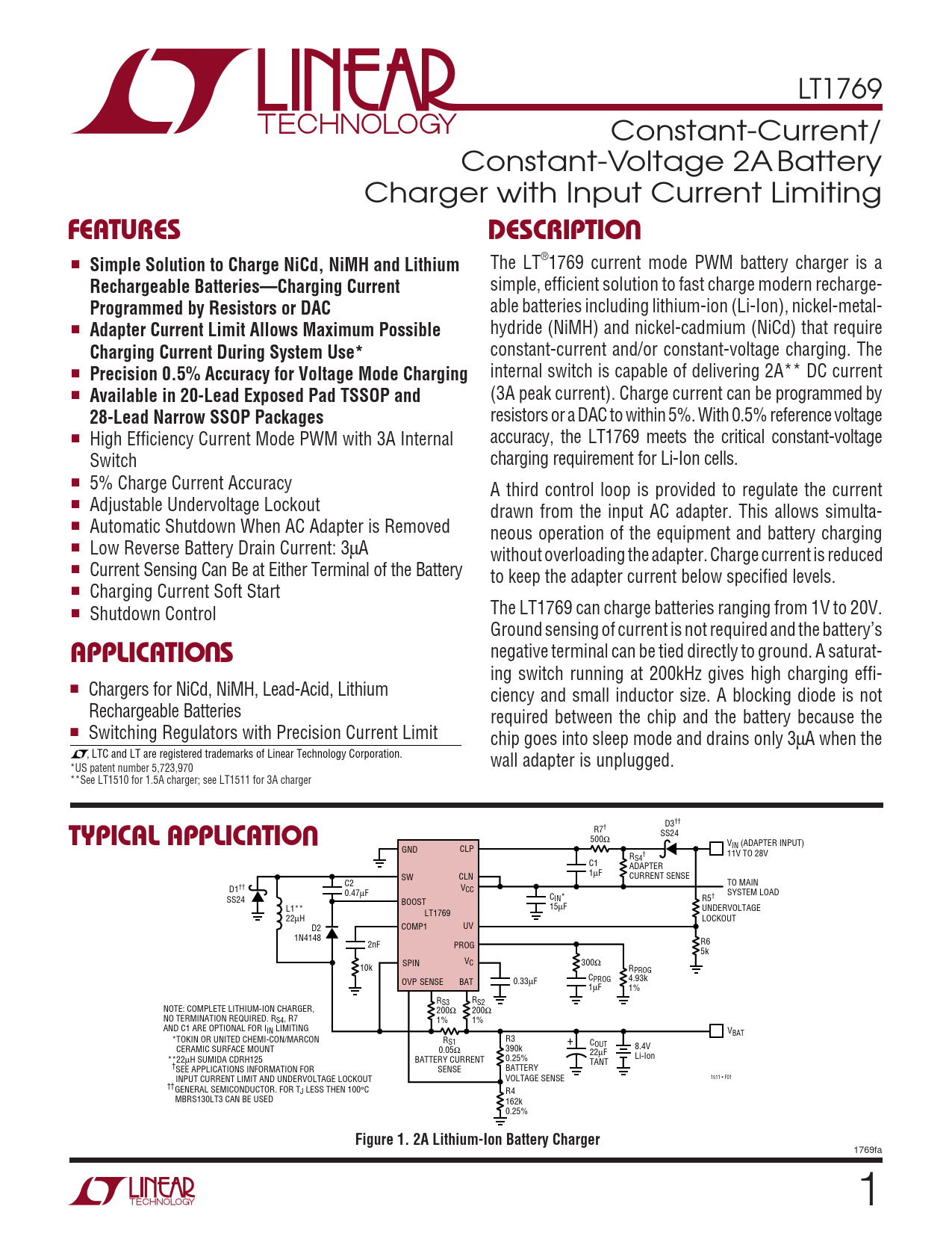 LT1769 Constant-Current/ Constant-Voltage 2A Battery Charger with Input Current Limiting UFEATURESDESCRIPTIO ■ Simple Solution to Charge NiCd, NiMH and Lithium The LT®1769 current mode PWM battery charger is a Rechargeable Batteries—Charging Current simple, efficient solution to fast charge modern recharge- Programmed by Resistors or DAC able batteries including lithium-ion (Li-Ion), nickel-metal- ■ Adapter Current Limit Allows Maximum Possible hydride (NiMH) and nickel-cadmium (NiCd) that require Charging Current During System Use* constant-current and/or constant-voltage charging. The ■ Precision 0.5% Accuracy for Voltage Mode Charging internal switch is capable of delivering 2A** DC current ■ Available in 20-Lead Exposed Pad TSSOP and (3A peak current). Charge current can be programmed by 28-Lead Narrow SSOP Packages resistors or a DAC to within 5%. With 0.5% reference voltage ■ High Efficiency Current Mode PWM with 3A Internal accuracy, the LT1769 meets the critical constant-voltage Switch charging requirement for Li-Ion cells. ■ 5% Charge Current Accuracy A third control loop is provided to regulate the current ■ Adjustable Undervoltage Lockout drawn from the input AC adapter. This allows simulta- ■ Automatic Shutdown When AC Adapter is Removed neous operation of the equipment and battery charging ■ Low Reverse Battery Drain Current: 3µA without overloading the adapter. Charge current is reduced ■ Current Sensing Can Be at Either Terminal of the Battery to keep the adapter current below specified levels. ■ Charging Current Soft Start ■ Shutdown Control The LT1769 can charge batteries ranging from 1V to 20V. Ground sensing of current is not required and the battery’s U negative terminal can be tied directly to ground. A saturat- APPLICATIO S ing switch running at 200kHz gives high charging effi- ■ Chargers for NiCd, NiMH, Lead-Acid, Lithium ciency and small inductor size. A blocking diode is not Rechargeable Batteries required between the chip and the battery because the ■ Switching Regulators with Precision Current Limit chip goes into sleep mode and drains only 3µA when the , LTC and LT are registered trademarks of Linear Technology Corporation. wall adapter is unplugged. *US patent number 5,723,970 **See LT1510 for 1.5A charger; see LT1511 for 3A charger U D3†† TYPICAL APPLICATIO R7† SS24 500Ω VIN (ADAPTER INPUT) GND CLP R † 11V TO 28V S4 C1 ADAPTER 1µF SW CLN CURRENT SENSE C2 TO MAIN V D1†† 0.47µF CC C SYSTEM LOAD SS24 BOOST IN* R5† 15 L1** µF UNDERVOLTAGE LT1769 22µH LOCKOUT D2 COMP1 UV 1N4148 R6 2nF PROG 5k SPIN VC 300Ω 10k RPROG C OVP SENSE BAT PROG 4.93k 0.33µF 1µF 1% RS3 RS2 NOTE: COMPLETE LITHIUM-ION CHARGER, 200Ω 200Ω NO TERMINATION REQUIRED. RS4, R7 1% 1% AND C1 ARE OPTIONAL FOR IIN LIMITING VBAT *TOKIN OR UNITED CHEMI-CON/MARCON R R3 S1 + COUT CERAMIC SURFACE MOUNT 0.05Ω 390k 8.4V 22µF **22µH SUMIDA CDRH125 BATTERY CURRENT 0.25% Li-Ion TANT †SEE APPLICATIONS INFORMATION FOR SENSE BATTERY INPUT CURRENT LIMIT AND UNDERVOLTAGE LOCKOUT VOLTAGE SENSE 1511 • F01 ††GENERAL SEMICONDUCTOR. FOR TJ LESS THEN 100°C R4 MBRS130LT3 CAN BE USED 162k 0.25% Figure 1. 2A Lithium-Ion Battery Charger 1769fa 1