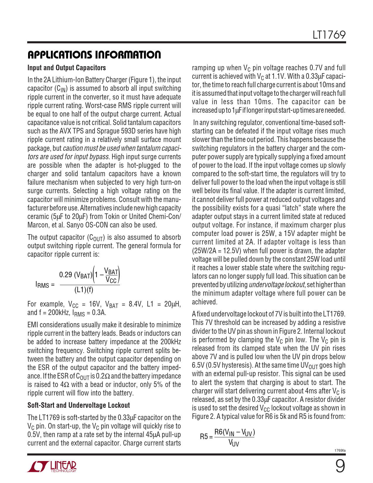 LT1769 UUWUAPPLICATIONS INFORMATION Input and Output Capacitors ramping up when VC pin voltage reaches 0.7V and full current is achieved with V In the 2A Lithium-Ion Battery Charger (Figure 1), the input C at 1.1V. With a 0.33µF capaci- tor, the time to reach full charge current is about 10ms and capacitor (CIN) is assumed to absorb all input switching it is assumed that input voltage to the charger will reach full ripple current in the converter, so it must have adequate value in less than 10ms. The capacitor can be ripple current rating. Worst-case RMS ripple current will increased up to 1µF if longer input start-up times are needed. be equal to one half of the output charge current. Actual capacitance value is not critical. Solid tantalum capacitors In any switching regulator, conventional time-based soft- such as the AVX TPS and Sprague 593D series have high starting can be defeated if the input voltage rises much ripple current rating in a relatively small surface mount slower than the time out period. This happens because the package, but caution must be used when tantalum capaci- switching regulators in the battery charger and the com- tors are used for input bypass. High input surge currents puter power supply are typically supplying a fixed amount are possible when the adapter is hot-plugged to the of power to the load. If the input voltage comes up slowly charger and solid tantalum capacitors have a known compared to the soft-start time, the regulators will try to failure mechanism when subjected to very high turn-on deliver full power to the load when the input voltage is still surge currents. Selecting a high voltage rating on the well below its final value. If the adapter is current limited, capacitor will minimize problems. Consult with the manu- it cannot deliver full power at reduced output voltages and facturer before use. Alternatives include new high capacity the possibility exists for a quasi “latch” state where the ceramic (5µF to 20µF) from Tokin or United Chemi-Con/ adapter output stays in a current limited state at reduced Marcon, et al. Sanyo OS-CON can also be used. output voltage. For instance, if maximum charger plus computer load power is 25W, a 15V adapter might be The output capacitor (COUT) is also assumed to absorb current limited at 2A. If adapter voltage is less than output switching ripple current. The general formula for (25W/2A = 12.5V) when full power is drawn, the adapter capacitor ripple current is: voltage will be pulled down by the constant 25W load until V it reaches a lower stable state where the switching regu- BAT 0.29 (VBAT () 1 – ) V lators can no longer supply full load. This situation can be I CC RMS = prevented by utilizing undervoltage lockout, set higher than (L1)(f) the minimum adapter voltage where full power can be For example, V achieved. CC = 16V, VBAT = 8.4V, L1 = 20µH, and f = 200kHz, IRMS = 0.3A. A fixed undervoltage lockout of 7V is built into the LT1769. EMI considerations usually make it desirable to minimize This 7V threshold can be increased by adding a resistive ripple current in the battery leads. Beads or inductors can divider to the UV pin as shown in Figure 2. Internal lockout be added to increase battery impedance at the 200kHz is performed by clamping the VC pin low. The VC pin is switching frequency. Switching ripple current splits be- released from its clamped state when the UV pin rises tween the battery and the output capacitor depending on above 7V and is pulled low when the UV pin drops below the ESR of the output capacitor and the battery imped- 6.5V (0.5V hysteresis). At the same time UVOUT goes high ance. If the ESR of C with an external pull-up resistor. This signal can be used OUT is 0.2Ω and the battery impedance is raised to 4Ω with a bead or inductor, only 5% of the to alert the system that charging is about to start. The ripple current will flow into the battery. charger will start delivering current about 4ms after VC is released, as set by the 0.33µF capacitor. A resistor divider Soft-Start and Undervoltage Lockout is used to set the desired VCC lockout voltage as shown in The LT1769 is soft-started by the 0.33µF capacitor on the Figure 2. A typical value for R6 is 5k and R5 is found from: VC pin. On start-up, the VC pin voltage will quickly rise to 0.5V, then ramp at a rate set by the internal 45µA pull-up R6(V – V ) R5 = IN UV current and the external capacitor. Charge current starts VUV 1769fa 9