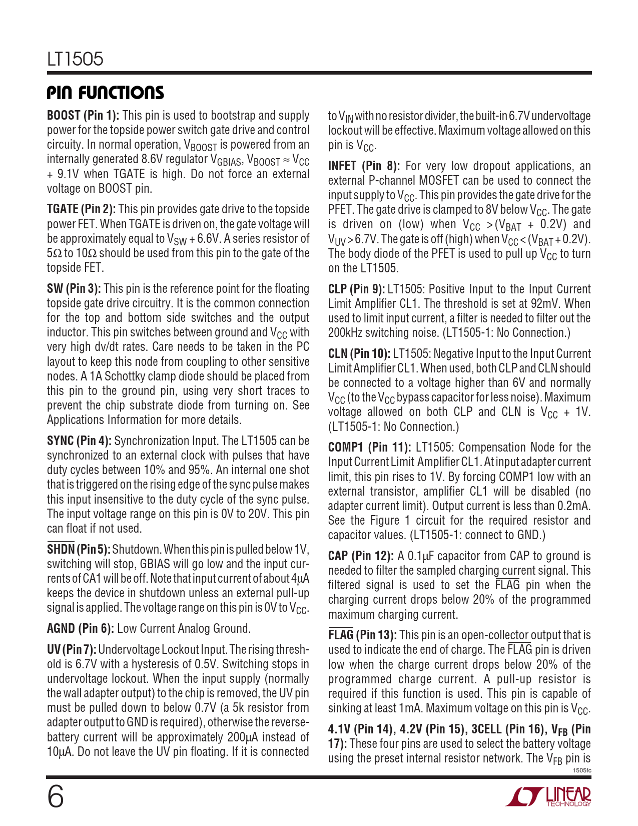 PIN FUNCTIONS. BOOST (Pin 1):. INFET (Pin 8):. TGATE (Pin 2):. SW (Pin 3):. CLP (Pin 9):. CLN (Pin 10):. SYNC (Pin 4):. COMP1 (Pin 11):