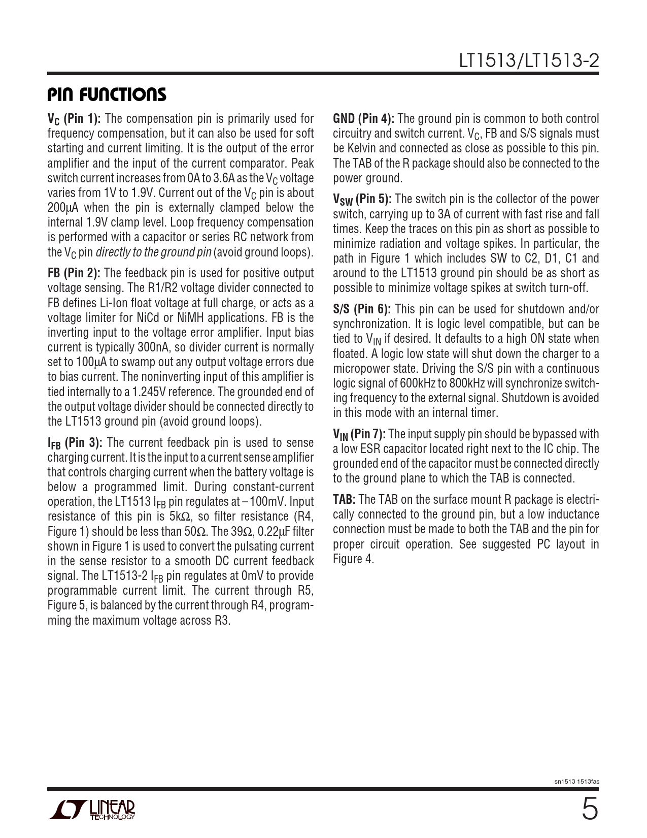 LT1513/LT1513-2 UUUPIN FUNCTIONSVC (Pin 1): The compensation pin is primarily used for GND (Pin 4): The ground pin is common to both control frequency compensation, but it can also be used for soft circuitry and switch current. VC, FB and S/S signals must starting and current limiting. It is the output of the error be Kelvin and connected as close as possible to this pin. amplifier and the input of the current comparator. Peak The TAB of the R package should also be connected to the switch current increases from 0A to 3.6A as the VC voltage power ground. varies from 1V to 1.9V. Current out of the VC pin is about V 200µA when the pin is externally clamped below the SW (Pin 5): The switch pin is the collector of the power switch, carrying up to 3A of current with fast rise and fall internal 1.9V clamp level. Loop frequency compensation times. Keep the traces on this pin as short as possible to is performed with a capacitor or series RC network from minimize radiation and voltage spikes. In particular, the the VC pin directly to the ground pin (avoid ground loops). path in Figure 1 which includes SW to C2, D1, C1 and FB (Pin 2): The feedback pin is used for positive output around to the LT1513 ground pin should be as short as voltage sensing. The R1/R2 voltage divider connected to possible to minimize voltage spikes at switch turn-off. FB defines Li-Ion float voltage at full charge, or acts as a S/S (Pin 6): This pin can be used for shutdown and/or voltage limiter for NiCd or NiMH applications. FB is the synchronization. It is logic level compatible, but can be inverting input to the voltage error amplifier. Input bias tied to V current is typically 300nA, so divider current is normally IN if desired. It defaults to a high ON state when floated. A logic low state will shut down the charger to a set to 100µA to swamp out any output voltage errors due micropower state. Driving the S/S pin with a continuous to bias current. The noninverting input of this amplifier is logic signal of 600kHz to 800kHz will synchronize switch- tied internally to a 1.245V reference. The grounded end of ing frequency to the external signal. Shutdown is avoided the output voltage divider should be connected directly to in this mode with an internal timer. the LT1513 ground pin (avoid ground loops). VIIN (Pin 7): The input supply pin should be bypassed with FB (Pin 3): The current feedback pin is used to sense a low ESR capacitor located right next to the IC chip. The charging current. It is the input to a current sense amplifier grounded end of the capacitor must be connected directly that controls charging current when the battery voltage is to the ground plane to which the TAB is connected. below a programmed limit. During constant-current operation, the LT1513 I TAB: The TAB on the surface mount R package is electri- FB pin regulates at – 100mV. Input resistance of this pin is 5kΩ, so filter resistance (R4, cally connected to the ground pin, but a low inductance Figure 1) should be less than 50Ω. The 39Ω, 0.22µF filter connection must be made to both the TAB and the pin for shown in Figure 1 is used to convert the pulsating current proper circuit operation. See suggested PC layout in in the sense resistor to a smooth DC current feedback Figure 4. signal. The LT1513-2 IFB pin regulates at 0mV to provide programmable current limit. The current through R5, Figure 5, is balanced by the current through R4, program- ming the maximum voltage across R3. sn1513 1513fas 5