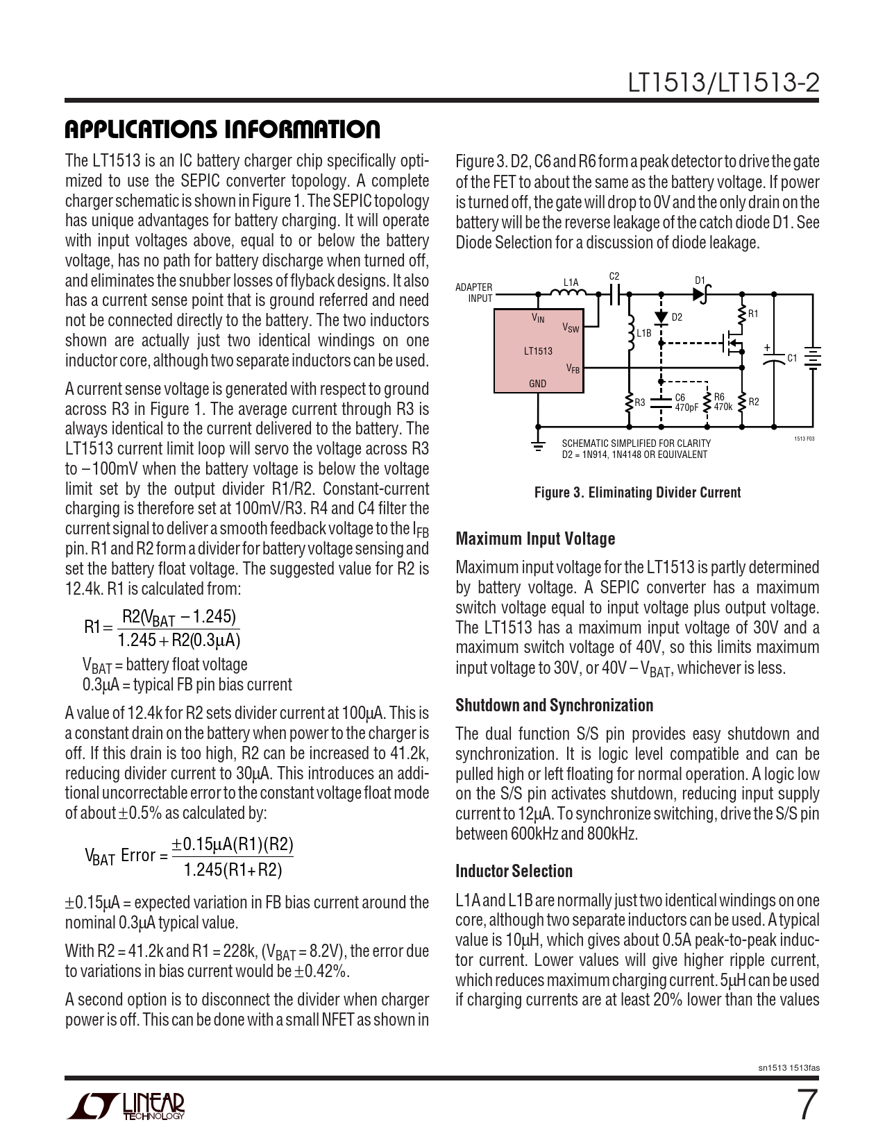 ±0.15µA = expected variation in FB bias current around the L1A and L1B are normally just two identical windings on one nominal 0.3µA typical value. core, although two separate inductors can be used. A typical value is 10µH, which gives about 0.5A peak-to-peak induc- With R2 = 41.2k and R1 = 228k, (VBAT = 8.2V), the error due tor current. Lower values will give higher ripple current, to variations in bias current would be ±0.42%. which reduces maximum charging current. 5µH can be used A second option is to disconnect the divider when charger if charging currents are at least 20% lower than the values power is off. This can be done with a small NFET as shown in sn1513 1513fas 7