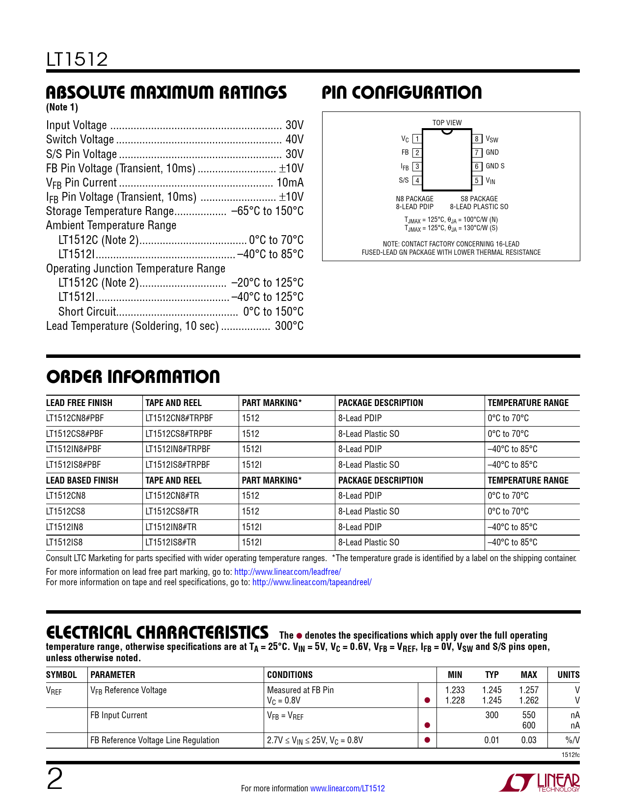 LT1512CN8#PBF LT1512CN8#TRPBF 1512 8-Lead PDIP 0°C to 70°C LT1512CS8#PBF LT1512CS8#TRPBF 1512 8-Lead Plastic SO 0°C to 70°C LT1512IN8#PBF LT1512IN8#TRPBF 1512I 8-Lead PDIP –40°C to 85°C LT1512IS8#PBF LT1512IS8#TRPBF 1512I 8-Lead Plastic SO –40°C to 85°C