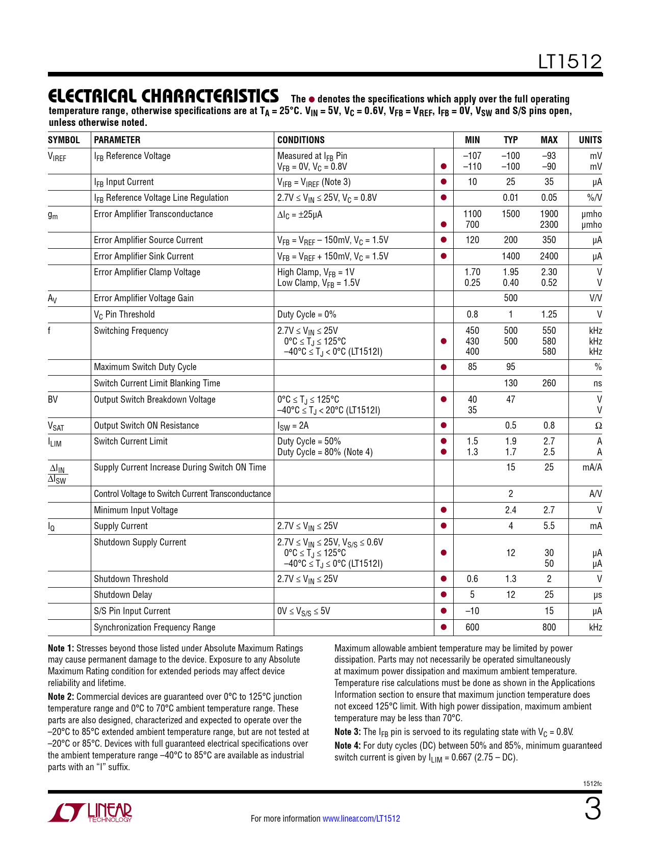 VIREF IFB Reference Voltage Measured at IFB Pin –107 –100 –93 mV VFB = 0V, VC = 0.8V l –110 –100 –90 mV IFB Input Current VIFB = VIREF (Note 3) l 10 25 35 µA IFB Reference Voltage Line Regulation 2.7V ≤ VIN ≤ 25V, VC = 0.8V l 0.01 0.05 %/V gm Error Amplifier Transconductance ∆IC = ±25µA 1100 1500 1900 µmho l 700 2300 µmho Error Amplifier Source Current VFB = VREF – 150mV, VC = 1.5V l 120 200 350 µA Error Amplifier Sink Current VFB = VREF + 150mV, VC = 1.5V l 1400 2400 µA Error Amplifier Clamp Voltage High Clamp, VFB = 1V 1.70 1.95 2.30 V Low Clamp, VFB = 1.5V 0.25 0.40 0.52 V AV Error Amplifier Voltage Gain 500 V/V VC Pin Threshold Duty Cycle = 0% 0.8 1 1.25 V f Switching Frequency 2.7V ≤ VIN ≤ 25V 450 500 550 kHz 0°C ≤ TJ ≤ 125°C l 430 500 580 kHz –40°C ≤ TJ < 0°C (LT1512I) 400 580 kHz Maximum Switch Duty Cycle l 85 95 % Switch Current Limit Blanking Time 130 260 ns BV Output Switch Breakdown Voltage 0°C ≤ TJ ≤ 125°C l 40 47 V –40°C ≤ TJ < 20°C (LT1512I) 35 V VSAT Output Switch ON Resistance ISw = 2A l 0.5 0.8 Ω ILIM Switch Current Limit Duty Cycle = 50% l 1.5 1.9 2.7 A Duty Cycle = 80% (Note 4) l 1.3 1.7 2.5 A ∆IIN Supply Current Increase During Switch ON Time 15 25 mA/A ∆ISw Control Voltage to Switch Current Transconductance 2 A/V Minimum Input Voltage l 2.4 2.7 V IQ Supply Current 2.7V ≤ VIN ≤ 25V l 4 5.5 mA Shutdown Supply Current 2.7V ≤ VIN ≤ 25V, VS/S ≤ 0.6V 0°C ≤ TJ ≤ 125°C l 12 30 µA –40°C ≤ TJ ≤ 0°C (LT1512I) 50 µA Shutdown Threshold 2.7V ≤ VIN ≤ 25V l 0.6 1.3 2 V Shutdown Delay l 5 12 25 µs S/S Pin Input Current 0V ≤ VS/S ≤ 5V l –10 15 µA Synchronization Frequency Range l 600 800 kHz