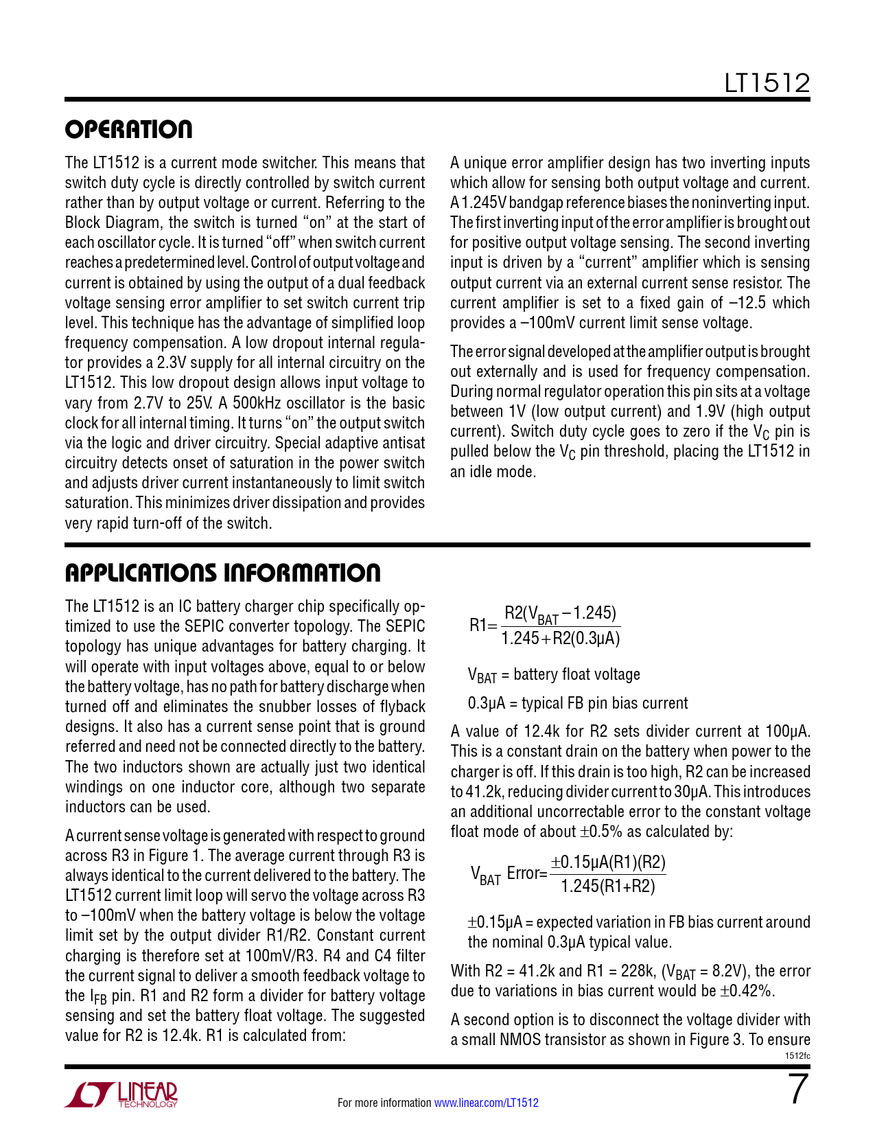 LT1512 operaTion The LT1512 is a current mode switcher. This means that A unique error amplifier design has two inverting inputs switch duty cycle is directly controlled by switch current which allow for sensing both output voltage and current. rather than by output voltage or current. Referring to the A 1.245V bandgap reference biases the noninverting input. Block Diagram, the switch is turned “on” at the start of The first inverting input of the error amplifier is brought out each oscillator cycle. It is turned “off” when switch current for positive output voltage sensing. The second inverting reaches a predetermined level. Control of output voltage and input is driven by a “current” amplifier which is sensing current is obtained by using the output of a dual feedback output current via an external current sense resistor. The voltage sensing error amplifier to set switch current trip current amplifier is set to a fixed gain of –12.5 which level. This technique has the advantage of simplified loop provides a –100mV current limit sense voltage. frequency compensation. A low dropout internal regula- The error signal developed at the amplifier output is brought tor provides a 2.3V supply for all internal circuitry on the out externally and is used for frequency compensation. LT1512. This low dropout design allows input voltage to During normal regulator operation this pin sits at a voltage vary from 2.7V to 25V. A 500kHz oscillator is the basic between 1V (low output current) and 1.9V (high output clock for all internal timing. It turns “on” the output switch current). Switch duty cycle goes to zero if the V via the logic and driver circuitry. Special adaptive antisat C pin is pulled below the V circuitry detects onset of saturation in the power switch C pin threshold, placing the LT1512 in an idle mode. and adjusts driver current instantaneously to limit switch saturation. This minimizes driver dissipation and provides very rapid turn-off of the switch. applicaTions inForMaTion The LT1512 is an IC battery charger chip specifically op- R2(V – 1 245 . ) timized to use the SEPIC converter topology. The SEPIC R BAT 1= topology has unique advantages for battery charging. It 1 245 . +R2 0 ( . µ 3 A) will operate with input voltages above, equal to or below V the battery voltage, has no path for battery discharge when BAT = battery float voltage turned off and eliminates the snubber losses of flyback 0.3µA = typical FB pin bias current designs. It also has a current sense point that is ground A value of 12.4k for R2 sets divider current at 100µA. referred and need not be connected directly to the battery. This is a constant drain on the battery when power to the The two inductors shown are actually just two identical charger is off. If this drain is too high, R2 can be increased windings on one inductor core, although two separate to 41.2k, reducing divider current to 30µA. This introduces inductors can be used. an additional uncorrectable error to the constant voltage A current sense voltage is generated with respect to ground float mode of about ±0.5% as calculated by: across R3 in Figure 1. The average current through R3 is 0.15 ± A( µ R1)(R2) always identical to the current delivered to the battery. The V Error= BAT LT1512 current limit loop will servo the voltage across R3 1.245(R1+R2) to –100mV when the battery voltage is below the voltage ±0.15µA = expected variation in FB bias current around limit set by the output divider R1/R2. Constant current the nominal 0.3µA typical value. charging is therefore set at 100mV/R3. R4 and C4 filter the current signal to deliver a smooth feedback voltage to with R2 = 41.2k and R1 = 228k, (VBAT = 8.2V), the error the I due to variations in bias current would be ±0.42%. FB pin. R1 and R2 form a divider for battery voltage sensing and set the battery float voltage. The suggested A second option is to disconnect the voltage divider with value for R2 is 12.4k. R1 is calculated from: a small NMOS transistor as shown in Figure 3. To ensure 1512fc For more information www.linear.com/LT1512 7 Document Outline Description Typical Application Absolute Maximum Ratings Pin Configuration Electrical Characteristics Typical Performance Characteristics Pin Functions Block Diagram Operation Applications Information Typical Application Related Parts