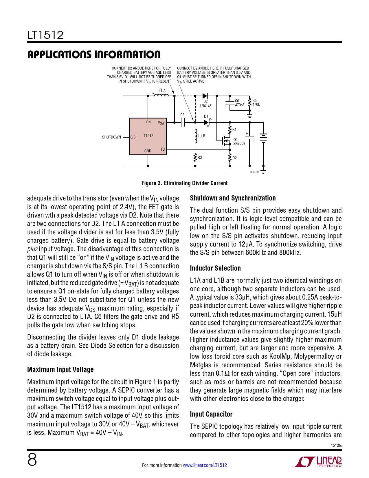 LT1512 applicaTions inForMaTion CONNECT D2 ANODE HERE FOR FULLY CONNECT D2 ANODE HERE IF FULLY CHARGED CHARGED BATTERY VOLTAGE LESS BATTERY VOLTAGE IS GREATER THAN 3.5V AND THAN 3.5V. Q1 WILL NOT BE TURNED OFF Q1 MUST BE TURNED OFF IN SHUTDOWN WITH IN SHUTDOWN IF VIN IS PRESENT VIN STILL ACTIVE L1 A • D2 C6 R5 1N4148 470pF 470k C2 D1 VIN VSW R1 + LT1512 L1 B SHUTDOWN S/S Q1 2N7002 GND FB R3 R2 1512 F03 Figure 3. Eliminating Divider Current adequate drive to the transistor (even when the VIN voltage Shutdown and Synchronization is at its lowest operating point of 2.4V), the FET gate is The dual function S/S pin provides easy shutdown and driven wth a peak detected voltage via D2. Note that there synchronization. It is logic level compatible and can be are two connections for D2. The L1 A connection must be pulled high or left floating for normal operation. A logic used if the voltage divider is set for less than 3.5V (fully low on the S/S pin activates shutdown, reducing input charged battery). Gate drive is equal to battery voltage supply current to 12µA. To synchronize switching, drive plus input voltage. The disadvantage of this connection is the S/S pin between 600kHz and 800kHz. that Q1 will still be “on” if the VIN voltage is active and the charger is shut down via the S/S pin. The L1 B connection Inductor Selection allows Q1 to turn off when VIN is off or when shutdown is initiated, but the reduced gate drive (= V L1A and L1B are normally just two identical windings on BAT) is not adequate to ensure a Q1 on-state for fully charged battery voltages one core, although two separate inductors can be used. less than 3.5V. Do not substitute for Q1 unless the new A typical value is 33µH, which gives about 0.25A peak-to- device has adequate V peak inductor current. Lower values will give higher ripple GS maximum rating, especially if D2 is connected to L1A. C6 filters the gate drive and R5 current, which reduces maximum charging current. 15µH pulls the gate low when switching stops. can be used if charging currents are at least 20% lower than the values shown in the maximum charging current graph. Disconnecting the divider leaves only D1 diode leakage Higher inductance values give slightly higher maximum as a battery drain. See Diode Selection for a discussion charging current, but are larger and more expensive. A of diode leakage. low loss toroid core such as KoolMµ, Molypermalloy or Metglas is recommended. Series resistance should be Maximum Input Voltage less than 0.1Ω for each winding. “Open core” inductors, Maximum input voltage for the circuit in Figure 1 is partly such as rods or barrels are not recommended because determined by battery voltage. A SEPIC converter has a they generate large magnetic fields which may interfere maximum switch voltage equal to input voltage plus out- with other electronics close to the charger. put voltage. The LT1512 has a maximum input voltage of 30V and a maximum switch voltage of 40V, so this limits Input Capacitor maximum input voltage to 30V, or 40V – VBAT, whichever The SEPIC topology has relatively low input ripple current is less. Maximum VBAT = 40V – VIN. compared to other topologies and higher harmonics are 1512fc 8 For more information www.linear.com/LT1512 Document Outline Description Typical Application Absolute Maximum Ratings Pin Configuration Electrical Characteristics Typical Performance Characteristics Pin Functions Block Diagram Operation Applications Information Typical Application Related Parts