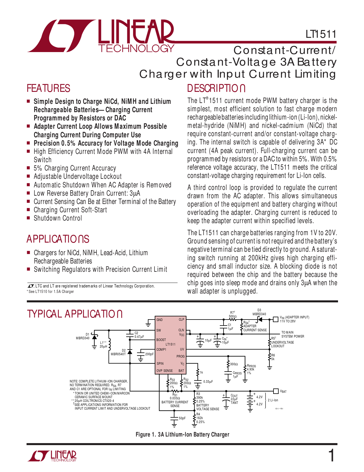 LT1511 Constant-Current/ Constant-Voltage 3A Battery Charger with Input Current Limiting UFEATURESDESCRIPTIO ■ Simple Design to Charge NiCd, NiMH and Lithium The LT®1511 current mode PWM battery charger is the Rechargeable Batteries—Charging Current simplest, most efficient solution to fast charge modern Programmed by Resistors or DAC rechargeable batteries including lithium-ion (Li-Ion), nickel- ■ Adapter Current Loop Allows Maximum Possible metal-hydride (NiMH) and nickel-cadmium (NiCd) that Charging Current During Computer Use require constant-current and/or constant-voltage charg- ■ Precision 0.5% Accuracy for Voltage Mode Charging ing. The internal switch is capable of delivering 3A* DC ■ High Efficiency Current Mode PWM with 4A Internal current (4A peak current). Full-charging current can be Switch programmed by resistors or a DAC to within 5%. With 0.5% ■ 5% Charging Current Accuracy reference voltage accuracy, the LT1511 meets the critical ■ Adjustable Undervoltage Lockout constant-voltage charging requirement for Li-Ion cells. ■ Automatic Shutdown When AC Adapter is Removed A third control loop is provided to regulate the current ■ Low Reverse Battery Drain Current: 3µA drawn from the AC adapter. This allows simultaneous ■ Current Sensing Can Be at Either Terminal of the Battery operation of the equipment and battery charging without ■ Charging Current Soft-Start overloading the adapter. Charging current is reduced to ■ Shutdown Control keep the adapter current within specified levels. U The LT1511 can charge batteries ranging from 1V to 20V. APPLICATIO S Ground sensing of current is not required and the battery’s negative terminal can be tied directly to ground. A saturat- ■ Chargers for NiCd, NiMH, Lead-Acid, Lithium ing switch running at 200kHz gives high charging effi- Rechargeable Batteries ciency and small inductor size. A blocking diode is not ■ Switching Regulators with Precision Current Limit required between the chip and the battery because the chip goes into sleep mode and drains only 3µA when the , LTC and LT are registered trademarks of Linear Technology Corporation. *See LT1510 for 1.5A Charger wall adapter is unplugged. U D3 R7† MBRD340 TYPICAL APPLICATIO 500Ω VIN (ADAPTER INPUT) GND CLP R † 11V TO 28V S4 C1 ADAPTER 1µF SW CLN CURRENT SENSE C2 TO MAIN D1 V 0.47µF CC + + SYSTEM POWER MBRD340 BOOST C R5† 10µF IN* L1** 10µF UNDERVOLTAGE LT1511 20µH LOCKOUT COMP1 UV D2 MBR0540T 200pF R6 PROG 5k SPIN VC 300Ω RPROG OVP SENSE BAT 4.93k 1k CPROG 1% 1µF RS3 RS2 NOTE: COMPLETE LITHIUM-ION CHARGER, 0.33µF 200Ω 200Ω NO TERMINATION REQUIRED. RS4, R7 1% 1% AND C1 ARE OPTIONAL FOR IIN LIMITING VBAT *TOKIN OR UNITED CHEMI-CON/MARCON R R3 + S1 + COUT CERAMIC SURFACE MOUNT 0.033Ω 390k 4.2V 22µF **20µH COILTRONICS CTX20-4 2 Li-Ion BATTERY CURRENT 0.25% + TANT †SEE APPLICATIONS INFORMATION FOR SENSE BATTERY 4.2V INPUT CURRENT LIMIT AND UNDERVOLTAGE LOCKOUT VOLTAGE SENSE 1511 • F01 R4 50pF 162k 0.25% Figure 1. 3A Lithium-Ion Battery Charger 1