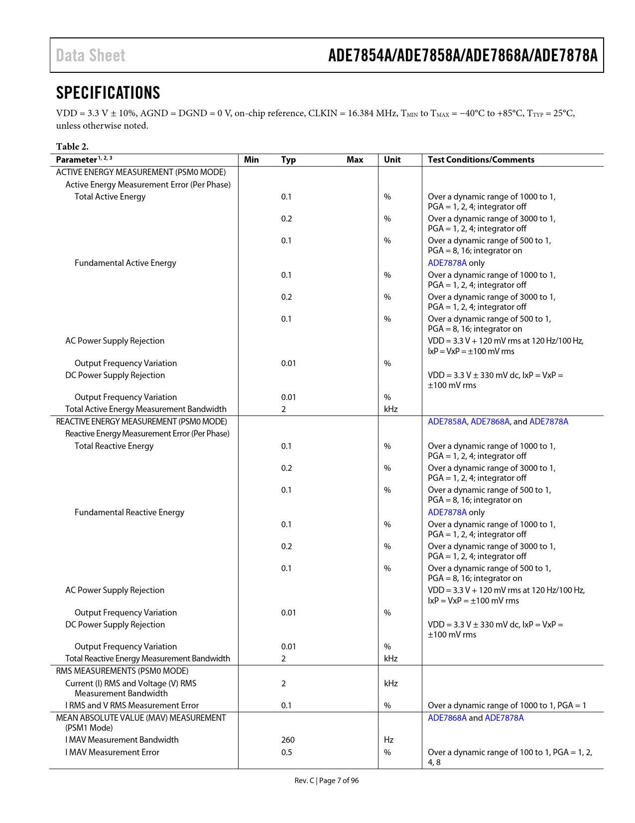 Data Sheet. ADE7854A/ADE7858A/ADE7868A/ADE7878A. SPECIFICATIONS. Table 2. Parameter1, 2, 3. Min. Typ. Max. Unit