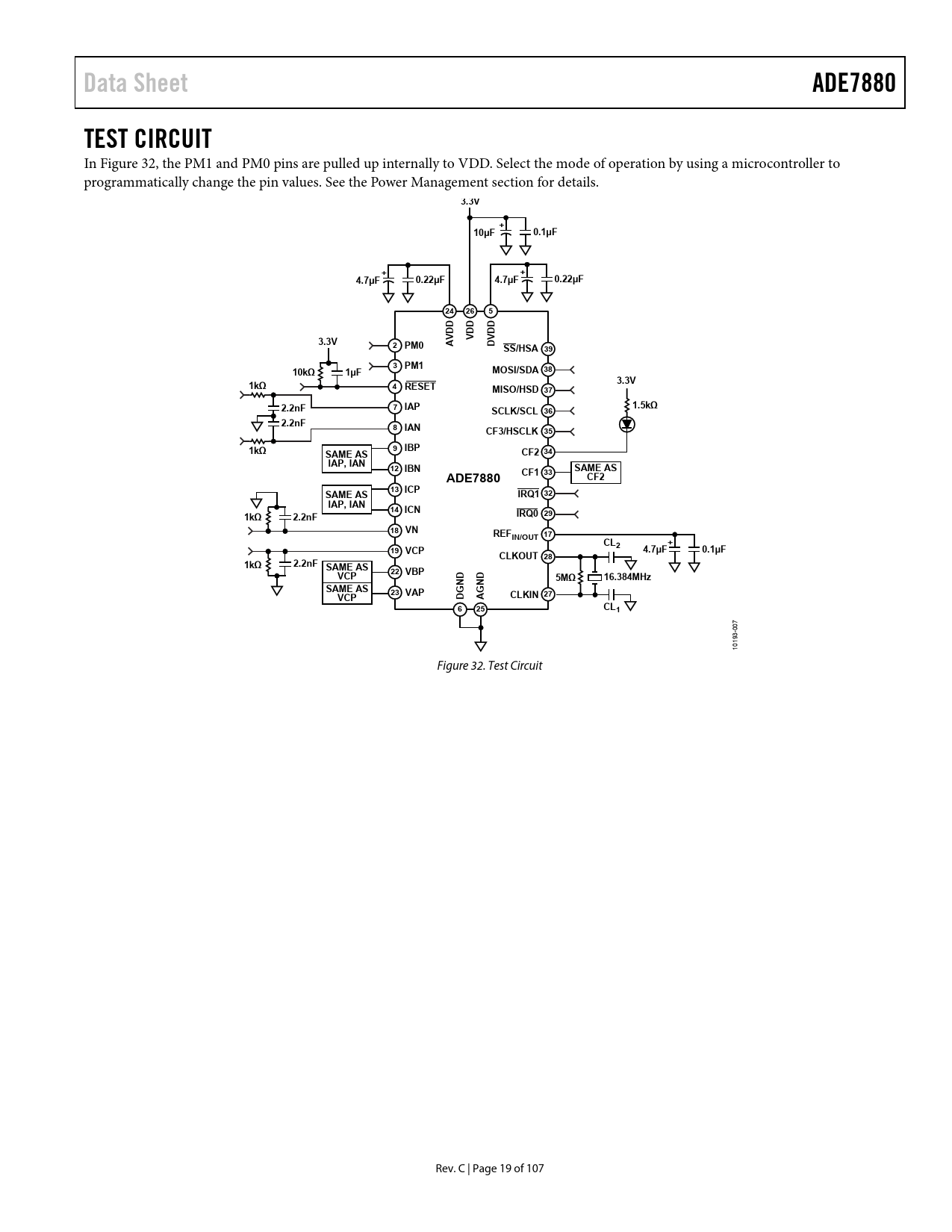 页数 / 页107 / 19 — Data Sheet. ADE7880. TEST CIRCUIT. 3.3V. 10µF. 0.1µF. 4.7µF. 0.22µF. VDD. …
