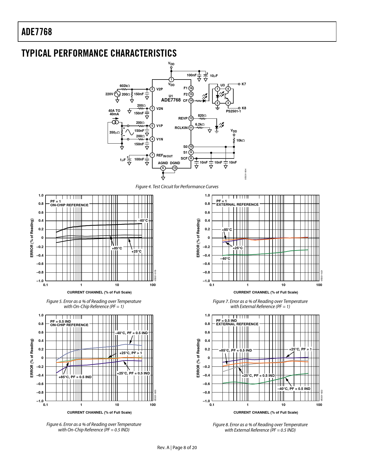 ADE7768. TYPICAL PERFORMANCE CHARACTERISTICS. VDD. 100nF. 602k. V2P. F1 16. 220V. 200. 150nF. F2 15. ADE7768 CF 14. V2N. 40A TO. PS2501-1. 40mA. 820