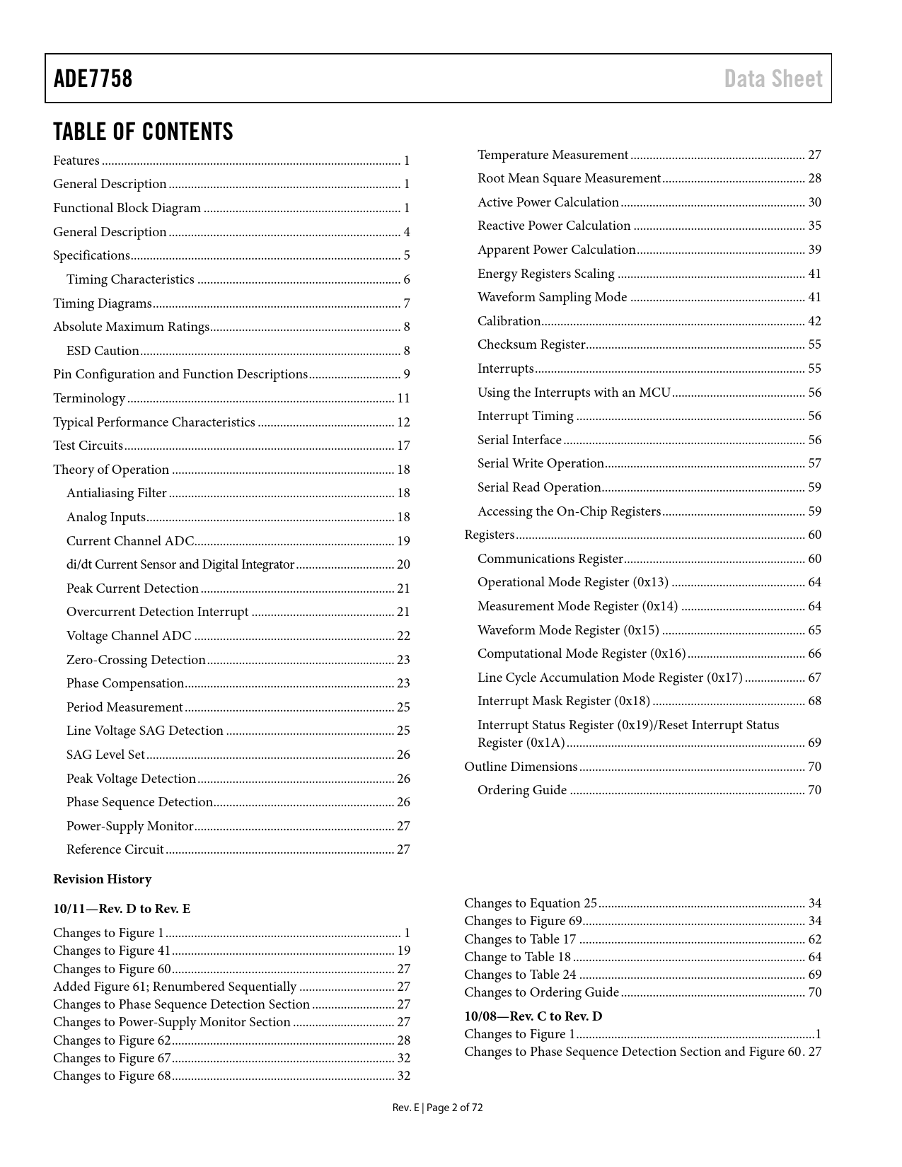 页数 / 页72 / 2 — ADE7758. Data Sheet. TABLE OF CONTENTS. Revision History. 10/11—Rev. D to …