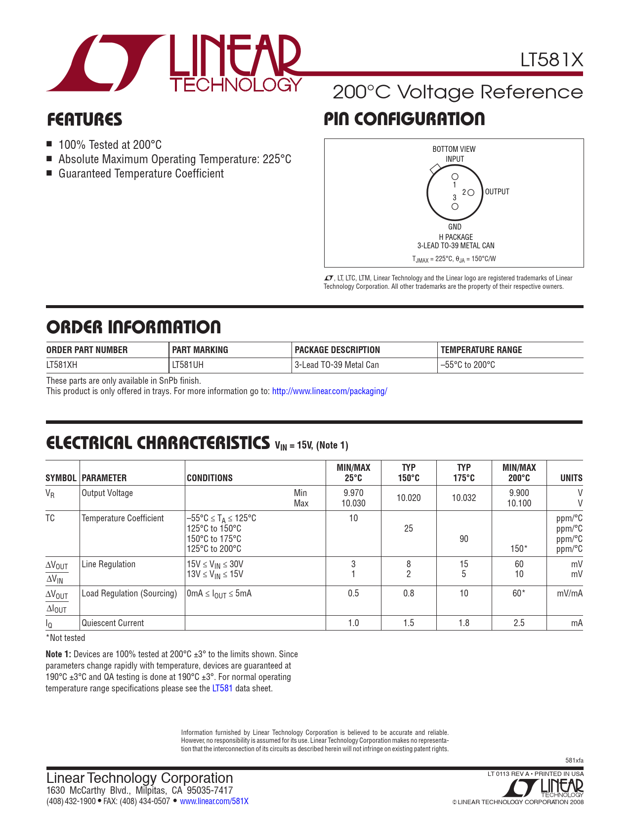 LT581X 200°C Voltage Reference FEATURESPin conFigURATion n 100% Tested at 200°C BOTTOM VIEW n Absolute Maximum Operating Temperature: 225°C INPUT n Guaranteed Temperature Coefficient 1 2 OUTPUT 3 GND H PACKAGE 3-LEAD TO-39 METAL CAN TJMAX = 225°C, θJA = 150°C/W L, LT, LTC, LTM, Linear Technology and the Linear logo are registered trademarks of Linear Technology Corporation. All other trademarks are the property of their respective owners. oRdER inFoRmATion ORDER PART NUMBERPART MARKINGPACKAGE DESCRIPTIONTEMPERATURE RANGE LT581XH LT581UH 3-Lead TO-39 Metal Can –55°C to 200°C These parts are only available in SnPb finish. This product is only offered in trays. For more information go to: http://www.linear.com/packaging/ ElEcTRicAl chARAcTERiSTicS VIN = 15V, (Note 1)MIN/MAXTYPTYPMIN/MAXSYMBOL PARAMETERCONDITIONS25°C150°C175°C200°CUNITS VR Output Voltage Min 9.970 V Max 10.030 10.020 10.032 9.900 10.100 V TC Temperature Coefficient –55°C ≤ TA ≤ 125°C 10 ppm/°C 125°C to 150°C 25 ppm/°C 150°C to 175°C 90 ppm/°C 125°C to 200°C 150* ppm/°C ∆VOUT Line Regulation 15V ≤ VIN ≤ 30V 3 8 15 60 mV ∆V 13V ≤ V 1 2 5 10 mV IN IN ≤ 15V ∆VOUT Load Regulation (Sourcing) 0mA ≤ IOUT ≤ 5mA 0.5 0.8 10 60* mV/mA ∆IOUT IQ Quiescent Current 1.0 1.5 1.8 2.5 mA *Not tested Note 1: Devices are 100% tested at 200°C ±3° to the limits shown. Since parameters change rapidly with temperature, devices are guaranteed at 190°C ±3°C and QA testing is done at 190°C ±3°. For normal operating temperature range specifications please see the LT581 data sheet. Information furnished by Linear Technology Corporation is believed to be accurate and reliable. However, no responsibility is assumed for its use. Linear Technology Corporation makes no representa- tion that the interconnection of its circuits as described herein will not infringe on existing patent rights. 581xfa Linear Technology Corporation LT 0113 REV A • PRINTED IN USA 1630 McCarthy Blvd., Milpitas, CA 95035-7417 (408) 432-1900 ● FAX: (408) 434-0507 ● www.linear.com/581X LINEAR TECHNOLOGY CORPORATION 2008 Document Outline Features Pin Configuration Order Information Electrical Characteristics