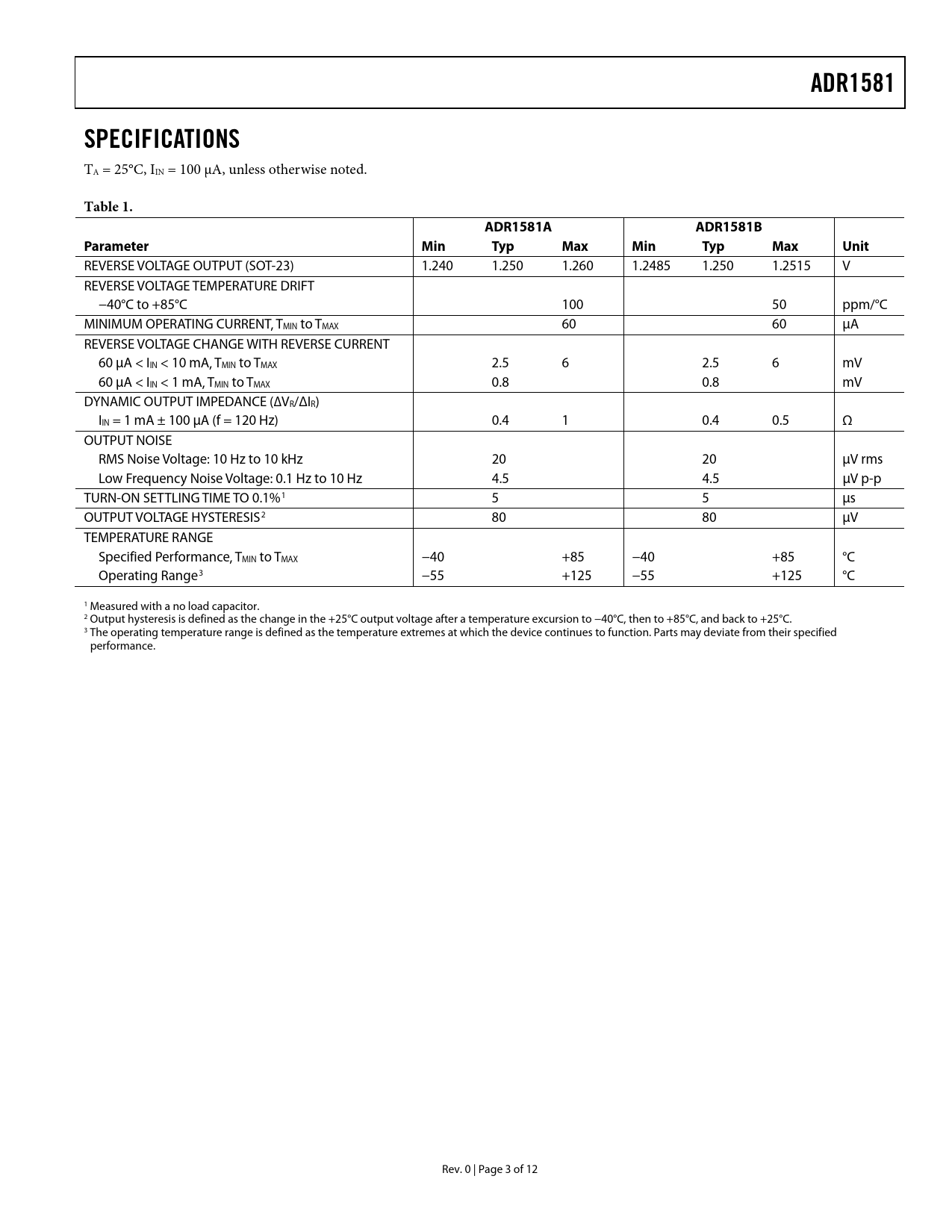 页数 / 页12 / 3 — ADR1581. SPECIFICATIONS. Table 1. ADR1581A. ADR1581B. Parameter Min. Typ. …