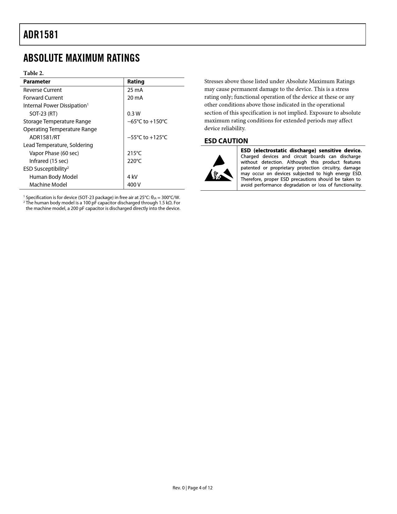 页数 / 页12 / 4 — ADR1581. ABSOLUTE MAXIMUM RATINGS. Table 2. Parameter Rating. ESD CAUTION