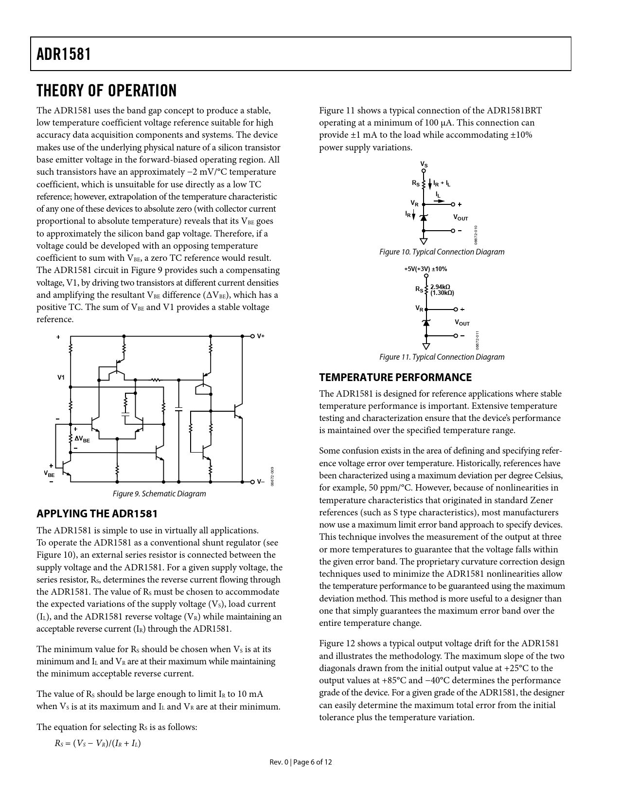 link to page 6 link to page 6 link to page 6 link to page 7 ADR1581THEORY OF OPERATION The ADR1581 uses the band gap concept to produce a stable, Figure 11 shows a typical connection of the ADR1581BRT low temperature coefficient voltage reference suitable for high operating at a minimum of 100 μA. This connection can accuracy data acquisition components and systems. The device provide ±1 mA to the load while accommodating ±10% makes use of the underlying physical nature of a silicon transistor power supply variations. base emitter voltage in the forward-biased operating region. All VS such transistors have an approximately −2 mV/°C temperature coefficient, which is unsuitable for use directly as a low TC RISR + IL reference; however, extrapolation of the temperature characteristic ILVR of any one of these devices to absolute zero (with collector current IRV proportional to absolute temperature) reveals that its V OUT BE goes 10 to approximately the silicon band gap voltage. Therefore, if a -0 72 66 voltage could be developed with an opposing temperature 0 Figure 10. Typical Connection Diagram coefficient to sum with VBE, a zero TC reference would result. The ADR1581 circuit in Figure 9 provides such a compensating +5V(+3V) ±10% voltage, V1, by driving two transistors at different current densities 2.94kΩRS and amplifying the resultant V (1.30kΩ) BE difference (ΔVBE), which has a positive TC. The sum of VBE and V1 provides a stable voltage VR reference. VOUT 11 V+ -0 72 66 0 Figure 11. Typical Connection Diagram V1TEMPERATURE PERFORMANCE The ADR1581 is designed for reference applications where stable temperature performance is important. Extensive temperature testing and characterization ensure that the device’s performance is maintained over the specified temperature range. ΔVBE Some confusion exists in the area of defining and specifying refer- ence voltage error over temperature. Historically, references have V 09 BE -0 been characterized using a maximum deviation per degree Celsius, 72 V– 066 for example, 50 ppm/°C. However, because of nonlinearities in Figure 9. Schematic Diagram temperature characteristics that originated in standard Zener references (such as S type characteristics), most manufacturers APPLYING THE ADR1581 now use a maximum limit error band approach to specify devices. The ADR1581 is simple to use in virtually all applications. This technique involves the measurement of the output at three To operate the ADR1581 as a conventional shunt regulator (see or more temperatures to guarantee that the voltage falls within Figure 10), an external series resistor is connected between the the given error band. The proprietary curvature correction design supply voltage and the ADR1581. For a given supply voltage, the techniques used to minimize the ADR1581 nonlinearities allow series resistor, RS, determines the reverse current flowing through the temperature performance to be guaranteed using the maximum the ADR1581. The value of RS must be chosen to accommodate deviation method. This method is more useful to a designer than the expected variations of the supply voltage (VS), load current one that simply guarantees the maximum error band over the (IL), and the ADR1581 reverse voltage (VR) while maintaining an entire temperature change. acceptable reverse current (IR) through the ADR1581. Figure 12 shows a typical output voltage drift for the ADR1581 The minimum value for RS should be chosen when VS is at its and illustrates the methodology. The maximum slope of the two minimum and IL and VR are at their maximum while maintaining diagonals drawn from the initial output value at +25°C to the the minimum acceptable reverse current. output values at +85°C and −40°C determines the performance The value of RS should be large enough to limit IR to 10 mA grade of the device. For a given grade of the ADR1581, the designer when VS is at its maximum and IL and VR are at their minimum. can easily determine the maximum total error from the initial tolerance plus the temperature variation. The equation for selecting RS is as follows: RS = (VS − VR)/(IR + IL) Rev. 0 | Page 6 of 12 Document Outline FEATURES APPLICATIONS GENERAL DESCRIPTION PIN CONFIGURATION TABLE OF CONTENTS REVISION HISTORY SPECIFICATIONS ABSOLUTE MAXIMUM RATINGS ESD CAUTION TYPICAL PERFORMANCE CHARACTERISTICS THEORY OF OPERATION APPLYING THE ADR1581 TEMPERATURE PERFORMANCE VOLTAGE OUTPUT NONLINEARITY VS. TEMPERATURE REVERSE VOLTAGE HYSTERESIS OUTPUT IMPEDANCE VS. FREQUENCY NOISE PERFORMANCE AND REDUCTION TURN-ON TIME TRANSIENT RESPONSE PRECISION MICROPOWER LOW DROPOUT REFERENCE USING THE ADR1581 WITH 3 V DATA CONVERTERS OUTLINE DIMENSIONS ORDERING GUIDE