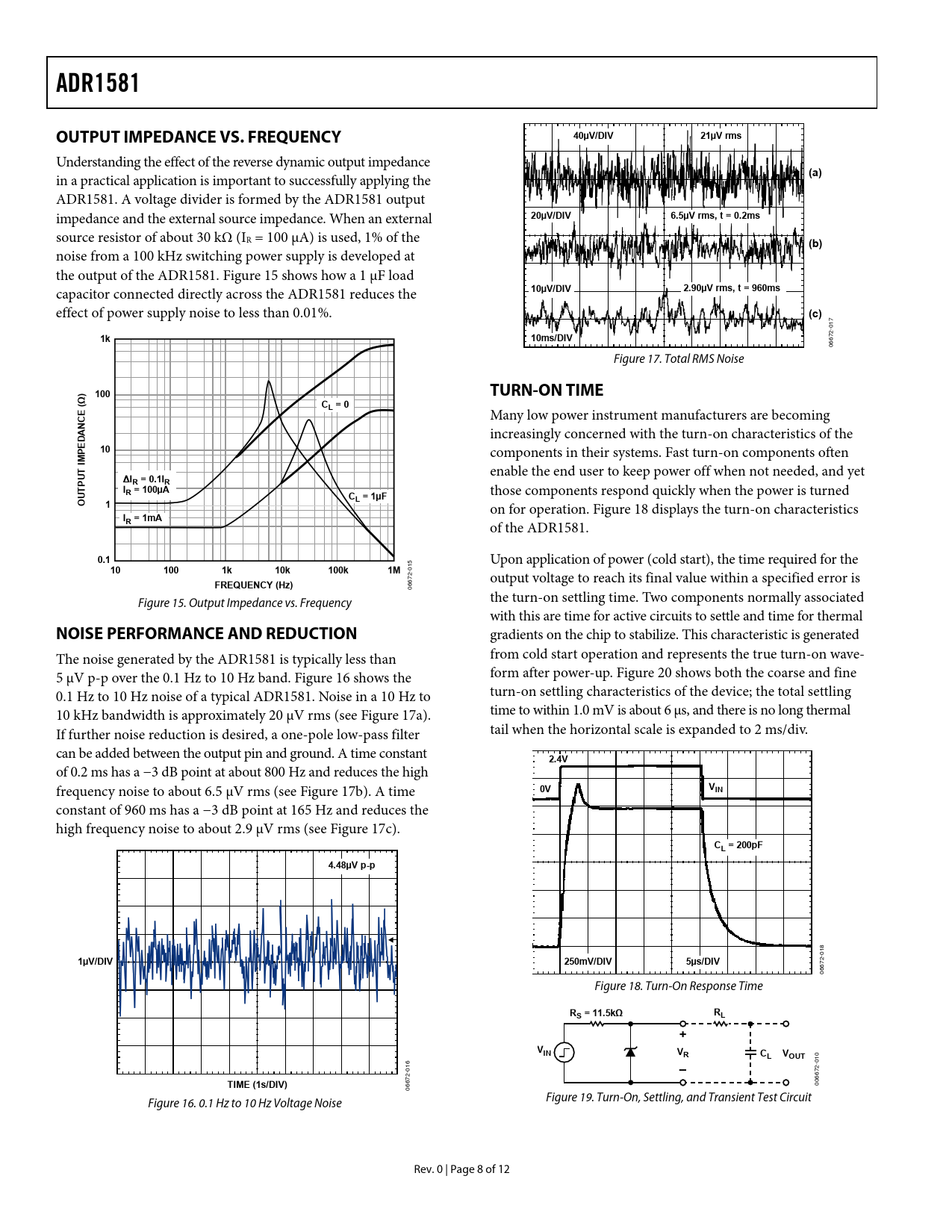 link to page 8 link to page 8 link to page 8 link to page 8 link to page 8 link to page 8 link to page 9 ADR158140µV/DIV21µV rmsOUTPUT IMPEDANCE VS. FREQUENCY Understanding the effect of the reverse dynamic output impedance (a) in a practical application is important to successfully applying the ADR1581. A voltage divider is formed by the ADR1581 output 20µV/DIV6.5µV rms, t = 0.2ms impedance and the external source impedance. When an external source resistor of about 30 kΩ (IR = 100 μA) is used, 1% of the (b) noise from a 100 kHz switching power supply is developed at the output of the ADR1581. Figure 15 shows how a 1 μF load 10µV/DIV2.90µV rms, t = 960ms capacitor connected directly across the ADR1581 reduces the effect of power supply noise to less than 0.01%. (c) 7 01 2- 1k10ms/DIV 67 06 Figure 17. Total RMS Noise ) 100TURN-ON TIMEΩC(L = 0 Many low power instrument manufacturers are becoming DANCE increasingly concerned with the turn-on characteristics of the E10P components in their systems. Fast turn-on components often M I UT enable the end user to keep power off when not needed, and yet ΔIR = 0.1IRP TIR = 100µAUC those components respond quickly when the power is turned L = 1µFO1 on for operation. Figure 18 displays the turn-on characteristics IR = 1mA of the ADR1581. 0.1 5 Upon application of power (cold start), the time required for the 101001k10k100k1M -01 72 output voltage to reach its final value within a specified error is FREQUENCY (Hz) 066 the turn-on settling time. Two components normally associated Figure 15. Output Impedance vs. Frequency with this are time for active circuits to settle and time for thermal NOISE PERFORMANCE AND REDUCTION gradients on the chip to stabilize. This characteristic is generated from cold start operation and represents the true turn-on wave- The noise generated by the ADR1581 is typically less than form after power-up. 5 μV p-p over the 0.1 Hz to 10 Hz band. Figure 20 shows both the coarse and fine Figure 16 shows the turn-on settling characteristics of the device; the total settling 0.1 Hz to 10 Hz noise of a typical ADR1581. Noise in a 10 Hz to time to within 1.0 mV is about 6 μs, and there is no long thermal 10 kHz bandwidth is approximately 20 μV rms (see Figure 17a). tail when the horizontal scale is expanded to 2 ms/div. If further noise reduction is desired, a one-pole low-pass filter can be added between the output pin and ground. A time constant 2.4V of 0.2 ms has a −3 dB point at about 800 Hz and reduces the high frequency noise to about 6.5 μV rms (see V0VIN Figure 17b). A time constant of 960 ms has a −3 dB point at 165 Hz and reduces the high frequency noise to about 2.9 μV rms (see Figure 17c). CL = 200pF4.48µV p-p 8 01 1µV/DIV250mV/DIV5µs/DIV 2- 67 06 Figure 18. Turn-On Response Time RS = 11.5kΩRL+VINVRCL VOUT 10 6 -0 1 0 – 72 2- 66 TIME (1s/DIV) 67 00 06 Figure 19. Turn-On, Settling, and Transient Test Circuit Figure 16. 0.1 Hz to 10 Hz Voltage Noise Rev. 0 | Page 8 of 12 Document Outline FEATURES APPLICATIONS GENERAL DESCRIPTION PIN CONFIGURATION TABLE OF CONTENTS REVISION HISTORY SPECIFICATIONS ABSOLUTE MAXIMUM RATINGS ESD CAUTION TYPICAL PERFORMANCE CHARACTERISTICS THEORY OF OPERATION APPLYING THE ADR1581 TEMPERATURE PERFORMANCE VOLTAGE OUTPUT NONLINEARITY VS. TEMPERATURE REVERSE VOLTAGE HYSTERESIS OUTPUT IMPEDANCE VS. FREQUENCY NOISE PERFORMANCE AND REDUCTION TURN-ON TIME TRANSIENT RESPONSE PRECISION MICROPOWER LOW DROPOUT REFERENCE USING THE ADR1581 WITH 3 V DATA CONVERTERS OUTLINE DIMENSIONS ORDERING GUIDE