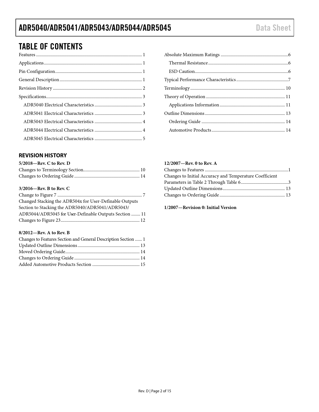 页数 / 页15 / 2 — ADR5040/ADR5041/ADR5043/ADR5044/ADR5045. Data Sheet. TABLE OF CONTENTS. …