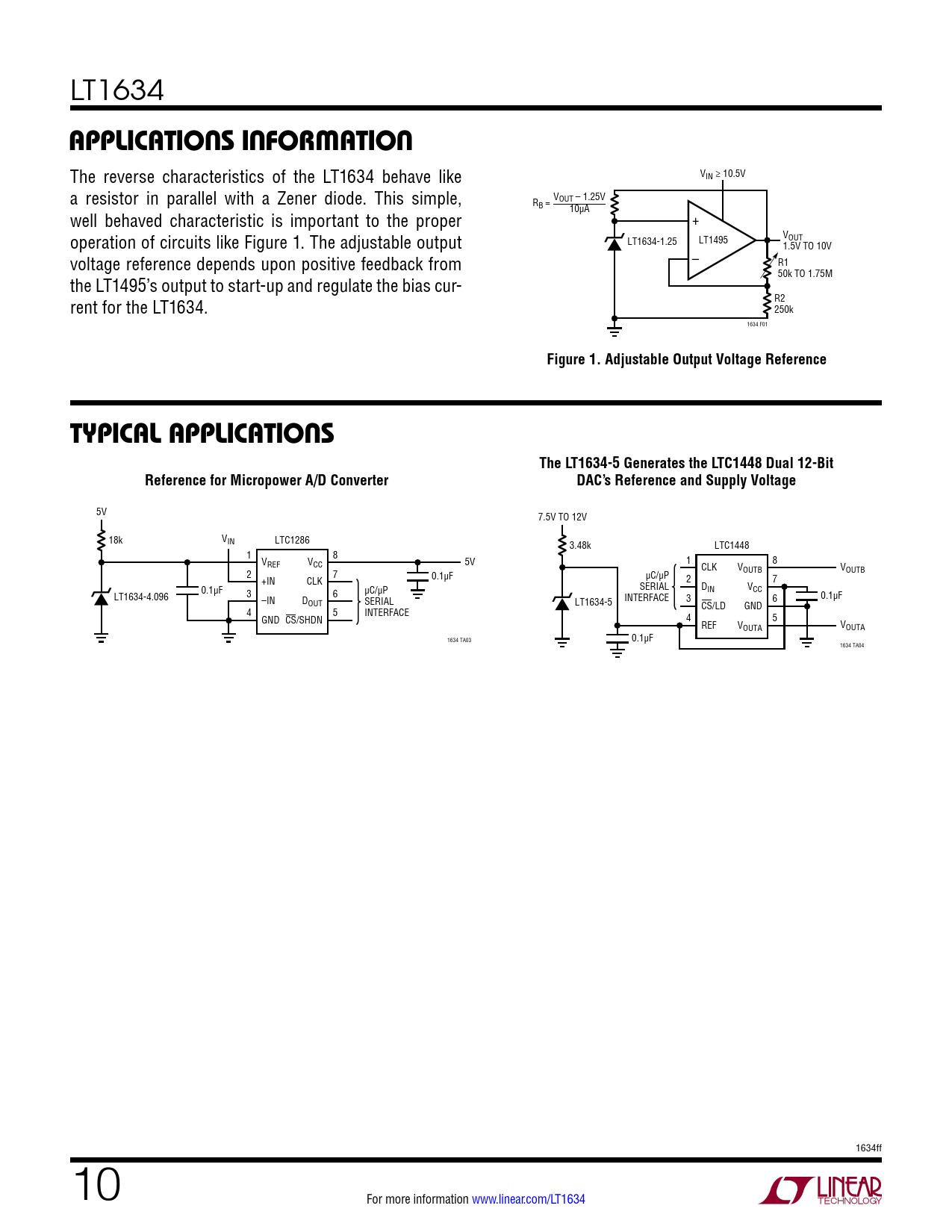 LT1634 applicaTions inForMaTion The reverse characteristics of the LT1634 behave like VIN ≥ 10.5V a resistor in paral el with a Zener diode. This simple, RB = VOUT – 1.25V well behaved characteristic is important to the proper 10µA + operation of circuits like Figure 1. The adjustable output V LT1634-1.25 LT1495 OUT 1.5V TO 10V voltage reference depends upon positive feedback from – R1 50k TO 1.75M the LT1495’s output to start-up and regulate the bias cur- rent for the LT1634. R2 250k 1634 F01 Figure 1. Adjustable Output Voltage ReferenceTypical applicaTionsThe LT1634-5 Generates the LTC1448 Dual 12-BitReference for Micropower A/D ConverterDAC’s Reference and Supply Voltage 5V 7.5V TO 12V 18k VIN LTC1286 3.48k LTC1448 1 8 VREF VCC 5V 1 8 CLK V V 2 7 OUTB OUTB µC/µP +IN CLK 0.1µF 2 7 0.1µF SERIAL D V 3 6 µC/µP IN CC LT1634-4.096 –IN D INTERFACE 0.1µF OUT SERIAL 3 6 LT1634-5 CS/LD GND 4 5 INTERFACE GND CS/SHDN 4 5 REF VOUTA VOUTA 1634 TA03 0.1µF 1634 TA04 1634ff 10 For more information www.linear.com/LT1634 Document Outline Features Description Applications Typical Application Absolute Maximum Ratings Applications Information Typical Application Related Parts