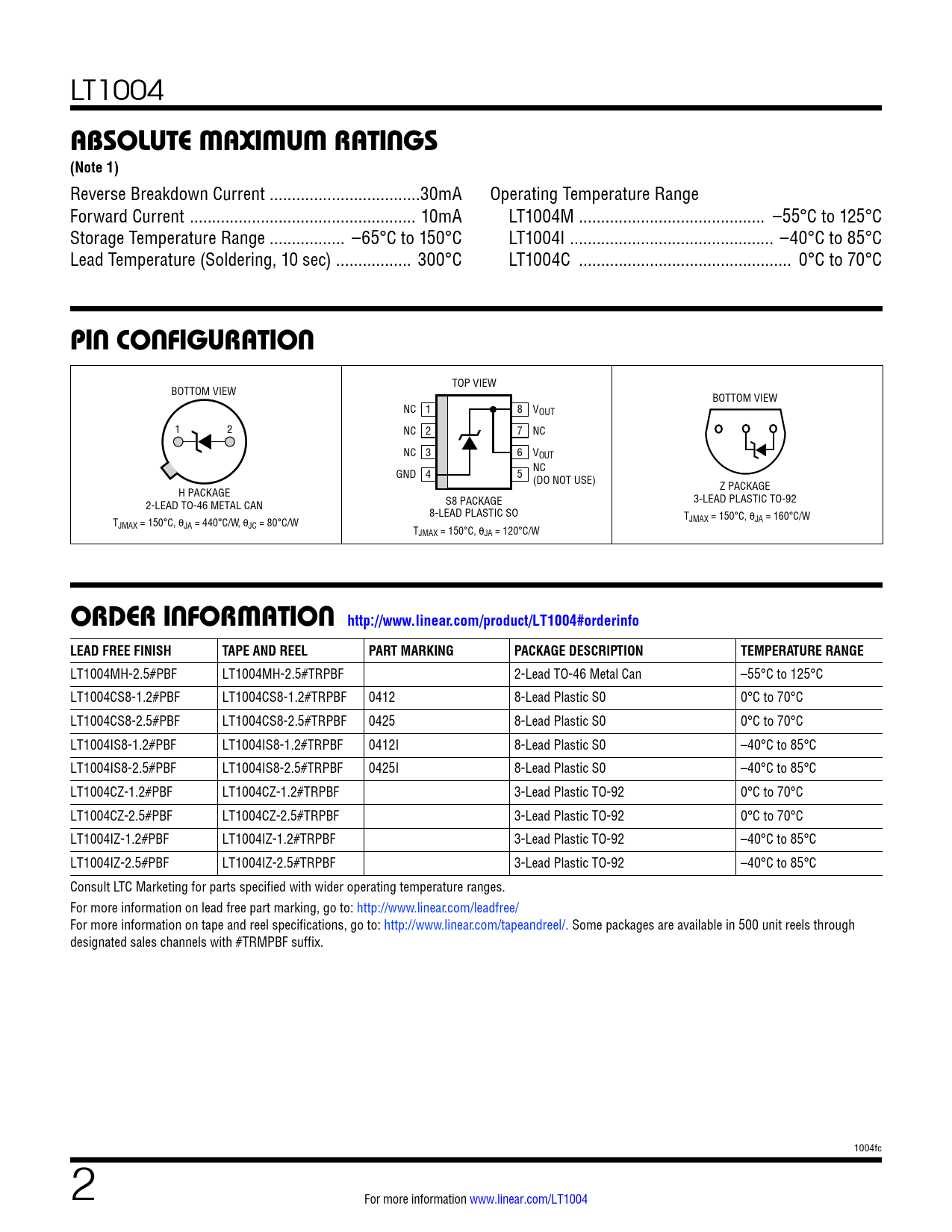LT1004 absoluTe MaxiMuM raTings (Note 1) Reverse Breakdown Current ..30mA Operating Temperature Range Forward Current ... 10mA LT1004M .. –55°C to 125°C Storage Temperature Range ... –65°C to 150°C LT1004I .. –40°C to 85°C Lead Temperature (Soldering, 10 sec) ... 300°C LT1004C .. 0°C to 70°C pin conFiguraTion TOP VIEW BOTTOM VIEW BOTTOM VIEW NC 1 8 VOUT 1 2 NC 2 7 NC NC 3 6 VOUT GND 4 5 NC (DO NOT USE) H PACKAGE Z PACKAGE 2-LEAD TO-46 METAL CAN S8 PACKAGE 3-LEAD PLASTIC TO-92 8-LEAD PLASTIC SO T TJMAX = 150°C, θJA = 160°C/W JMAX = 150°C, θJA = 440°C/W, θJC = 80°C/W TJMAX = 150°C, θJA = 120°C/W orDer inForMaTion http://www.linear.com/product/LT1004#orderinfoLEAD FREE FINISHTAPE AND REELPART MARKINGPACKAGE DESCRIPTIONTEMPERATURE RANGE LT1004MH-2.5#PBF LT1004MH-2.5#TRPBF 2-Lead TO-46 Metal Can –55°C to 125°C LT1004CS8-1.2#PBF LT1004CS8-1.2#TRPBF 0412 8-Lead Plastic S0 0°C to 70°C LT1004CS8-2.5#PBF LT1004CS8-2.5#TRPBF 0425 8-Lead Plastic S0 0°C to 70°C LT1004IS8-1.2#PBF LT1004IS8-1.2#TRPBF 0412I 8-Lead Plastic S0 –40°C to 85°C LT1004IS8-2.5#PBF LT1004IS8-2.5#TRPBF 0425I 8-Lead Plastic S0 –40°C to 85°C LT1004CZ-1.2#PBF LT1004CZ-1.2#TRPBF 3-Lead Plastic TO-92 0°C to 70°C LT1004CZ-2.5#PBF LT1004CZ-2.5#TRPBF 3-Lead Plastic TO-92 0°C to 70°C LT1004IZ-1.2#PBF LT1004IZ-1.2#TRPBF 3-Lead Plastic TO-92 –40°C to 85°C LT1004IZ-2.5#PBF LT1004IZ-2.5#TRPBF 3-Lead Plastic TO-92 –40°C to 85°C Consult LTC Marketing for parts specified with wider operating temperature ranges. For more information on lead free part marking, go to: http://www.linear.com/leadfree/ For more information on tape and reel specifications, go to: http://www.linear.com/tapeandreel/. Some packages are available in 500 unit reels through designated sales channels with #TRMPBF suffix. 1004fc 2 For more information www.linear.com/LT1004