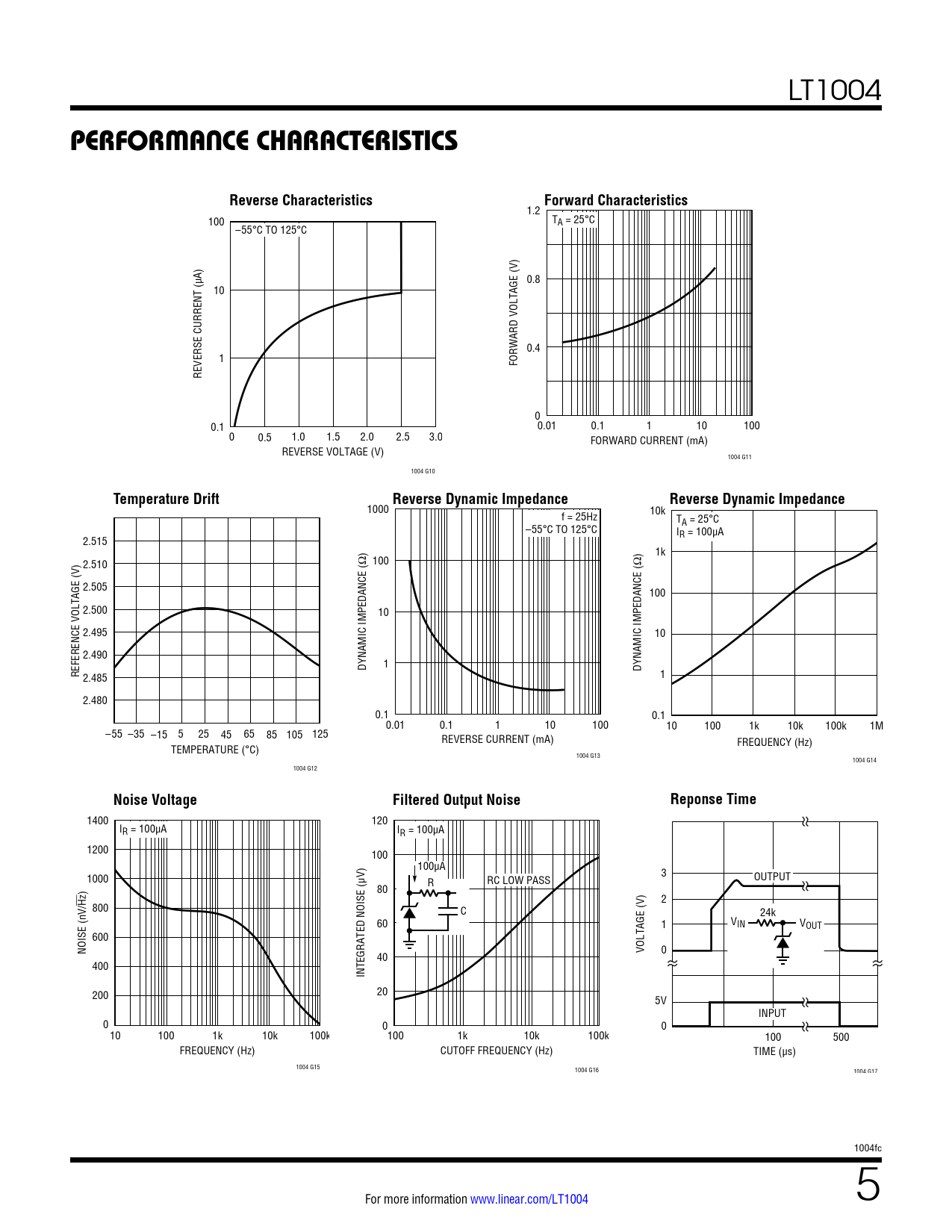 1000 f = 25Hz 10k TA = 25°C –55°C TO 125°C IR = 100µA 2.515 1k 2.510 100 2.505 100 2.500 10 2.495 10 2.490 DYNAMIC IMPEDANCE (Ω) 1 REFERENCE VOLTAGE (V) DYNAMIC IMPEDANCE (Ω) 2.485 1 2.480 0.1 0.1 0.01 0.1 1 10 100 10 100 1k 10k 100k 1M –55 –35 –15 5 25 45 65 85 105 125 REVERSE CURRENT (mA) FREQUENCY (Hz) TEMPERATURE (°C) 1004 G13 1004 G14 1004 G12