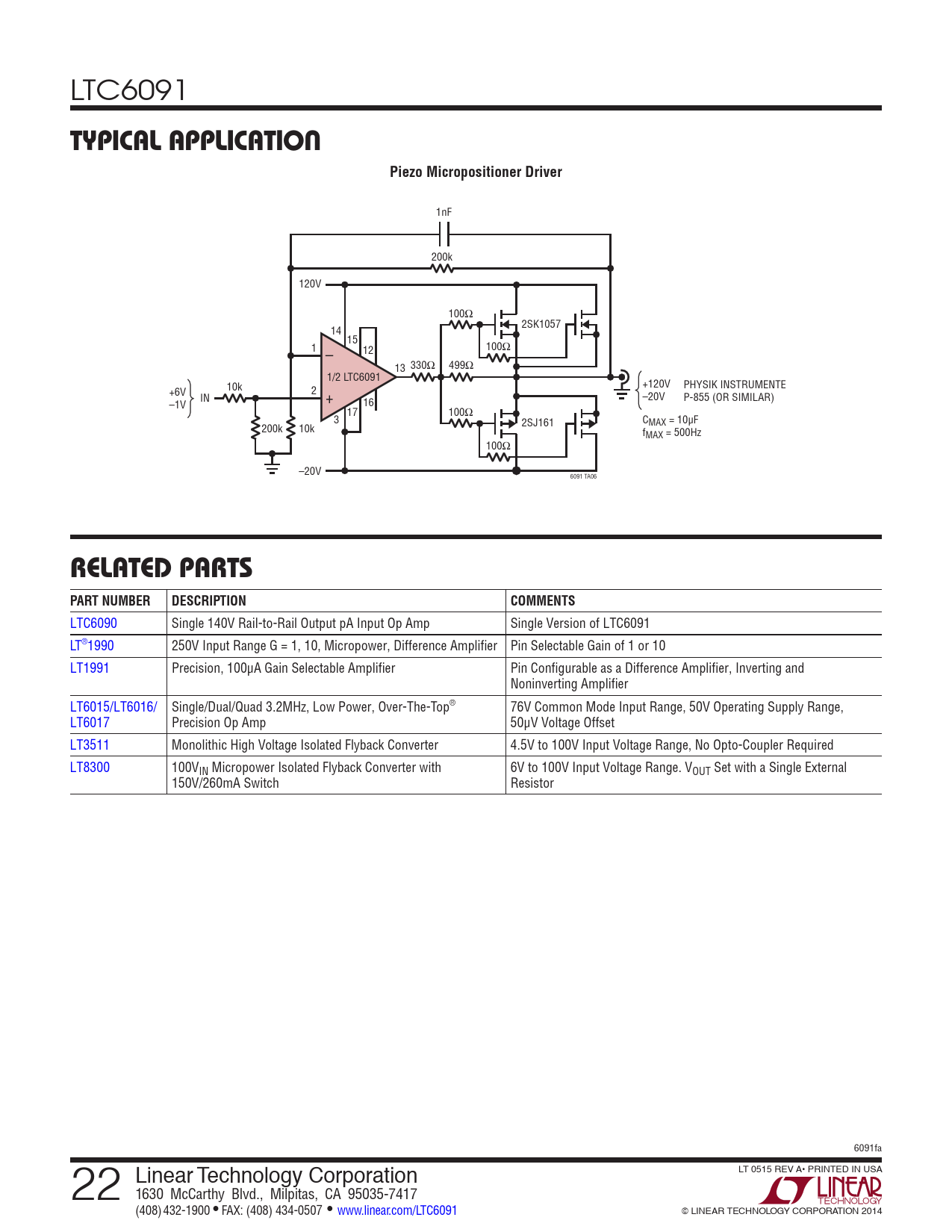 页数 / 页22 / 22 — TYPICAL APPLICATION. Piezo Micropositioner Driver. RELATED PARTS PART …