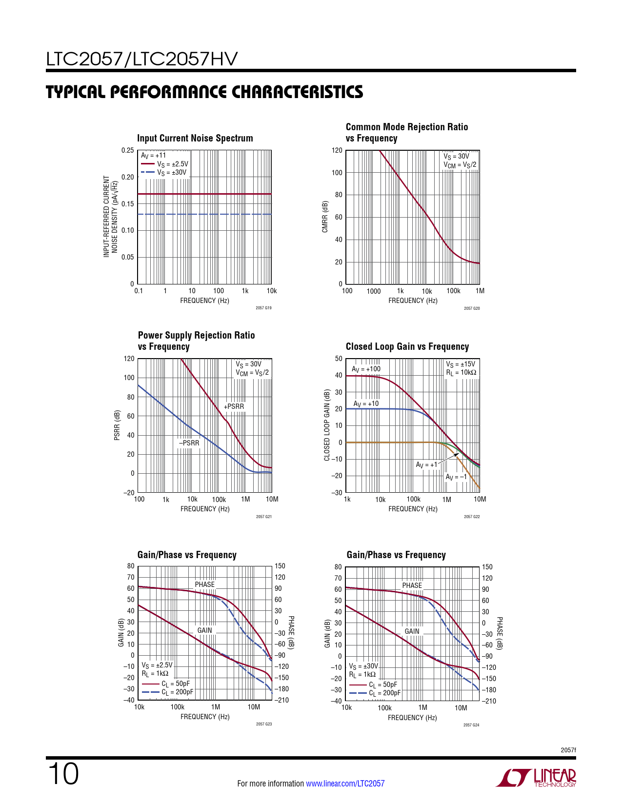 120 50 VS = 30V VS = ±15V V AV = +100 R 100 CM = VS/2 40 L = 10kΩ 30 80 +PSRR A 20 V = +10 60 10 40 PSRR (dB) –PSRR 0 20 CLOSED LOOP GAIN (dB) –10 AV = +1 0 –20 AV = –1 –20 –30 100 1k 10k 100k 1M 10M 1k 10k 100k 1M 10M FREQUENCY (Hz) FREQUENCY (Hz) 2057 G21 2057 G22