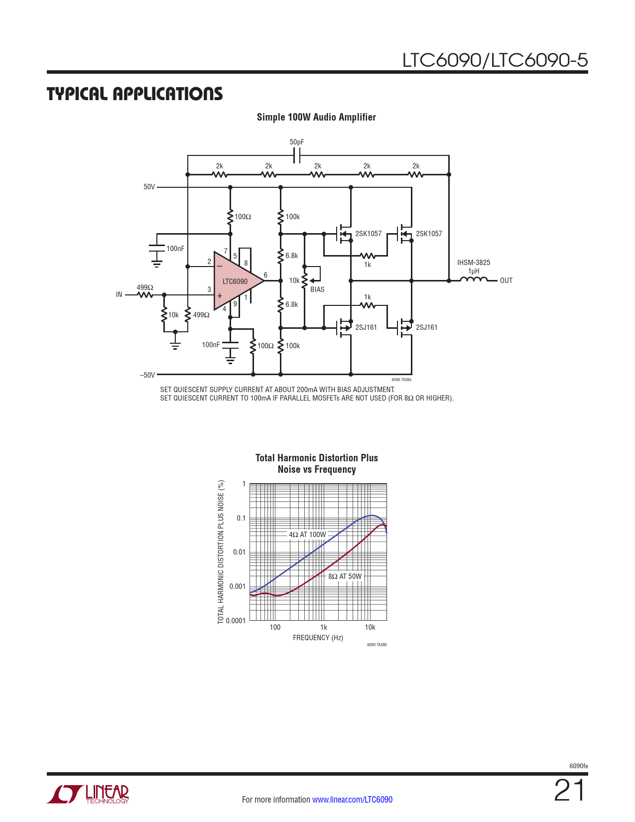 50pF 2k 2k 2k 2k 2k 50V 100Ω 100k 2SK1057 2SK1057 100nF 7 5 6.8k 2 – 8 IHSM-3825 1k 6 1µH LTC6090 10k OUT 499Ω 3 BIAS IN + 1 1k 9 6.8k 4 10k 499Ω 2SJ161 2SJ161 100nF 100Ω 100k –50V 6090 TA08a SET QUIESCENT SUPPLY CURRENT AT ABOUT 200mA WITH BIAS ADJUSTMENT. SET QUIESCENT CURRENT TO 100mA IF PARALLEL MOSFETs ARE NOT USED (FOR 8Ω OR HIGHER).