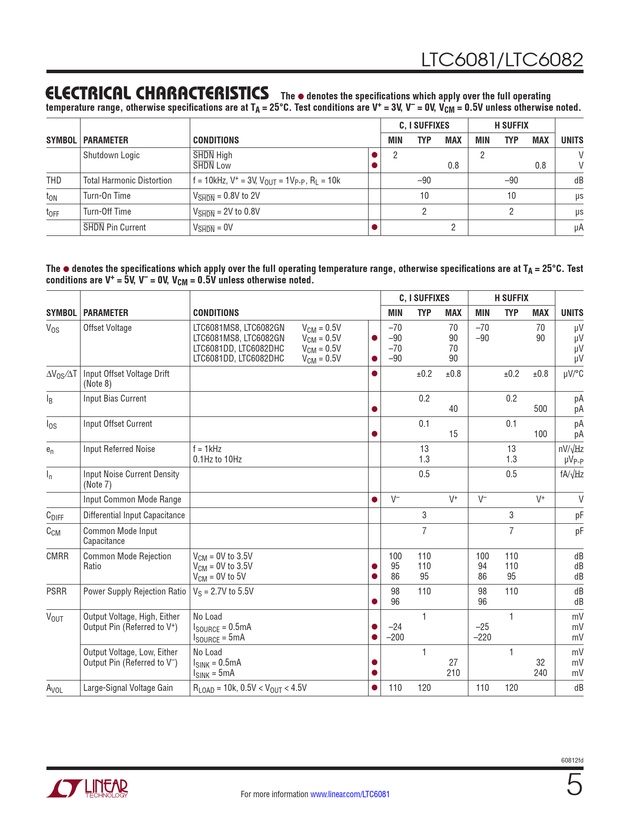 denotes the specifications which apply over the full operating temperature range, otherwise specifications are at TA = 25°C. Test conditions are V+ = 5V, V– = 0V, VCM = 0.5V unless otherwise noted. C, I SUFFIXES H SUFFIX SYMBOL PARAMETER CONDITIONS MIN TYP MAX MIN TYP MAX UNITS