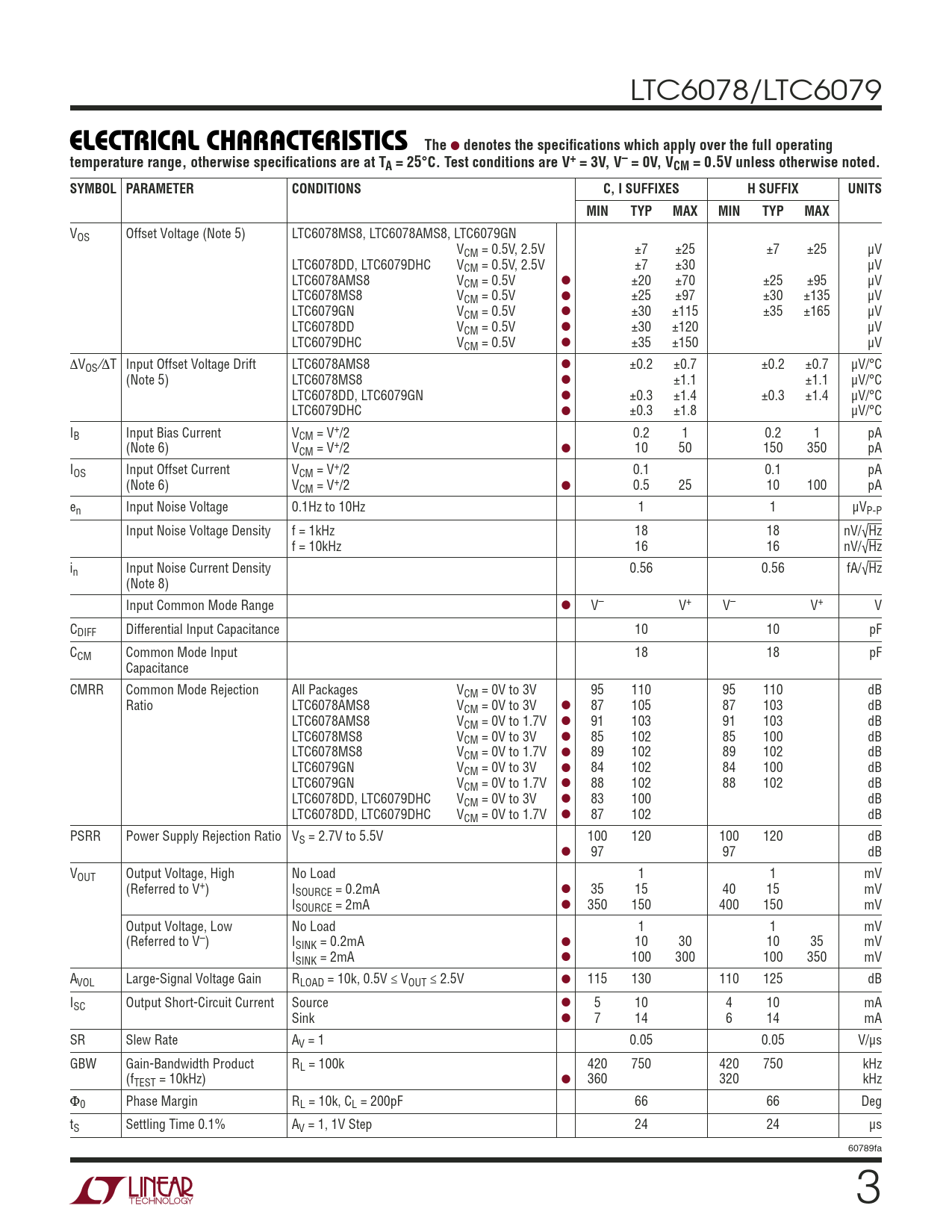 VOS Offset Voltage (Note 5) LTC6078MS8, LTC6078AMS8, LTC6079GN VCM = 0.5V, 2.5V ±7 ±25 ±7 ±25 μV LTC6078DD, LTC6079DHC VCM = 0.5V, 2.5V ±7 ±30 μV LTC6078AMS8 VCM = 0.5V ● ±20 ±70 ±25 ±95 μV LTC6078MS8 VCM = 0.5V ● ±25 ±97 ±30 ±135 μV LTC6079GN VCM = 0.5V ● ±30 ±115 ±35 ±165 μV LTC6078DD VCM = 0.5V ● ±30 ±120 μV LTC6079DHC VCM = 0.5V ● ±35 ±150 μV ΔVOS ⁄ΔT Input Offset Voltage Drift LTC6078AMS8 ● ±0.2 ±0.7 ±0.2 ±0.7 μV/°C (Note 5) LTC6078MS8 ● ±1.1 ±1.1 μV/°C LTC6078DD, LTC6079GN ● ±0.3 ±1.4 ±0.3 ±1.4 μV/°C LTC6079DHC ● ±0.3 ±1.8 μV/°C IB Input Bias Current VCM = V+/2 0.2 1 0.2 1 pA (Note 6) VCM = V+/2 ● 10 50 150 350 pA IOS Input Offset Current VCM = V+/2 0.1 0.1 pA (Note 6) VCM = V+/2 ● 0.5 25 10 100 pA en Input Noise Voltage 0.1Hz to 10Hz 1 1 µVP-P Input Noise Voltage Density f = 1kHz 18 18 nV/√Hz f = 10kHz 16 16 nV/√Hz in Input Noise Current Density 0.56 0.56 fA/√Hz (Note 8) Input Common Mode Range ● V– V+ V– V+ V CDIFF Differential Input Capacitance 10 10 pF CCM Common Mode Input 18 18 pF Capacitance CMRR Common Mode Rejection All Packages VCM = 0V to 3V 95 110 95 110 dB Ratio LTC6078AMS8 VCM = 0V to 3V ● 87 105 87 103 dB LTC6078AMS8 VCM = 0V to 1.7V ● 91 103 91 103 dB LTC6078MS8 VCM = 0V to 3V ● 85 102 85 100 dB LTC6078MS8 VCM = 0V to 1.7V ● 89 102 89 102 dB LTC6079GN VCM = 0V to 3V ● 84 102 84 100 dB LTC6079GN VCM = 0V to 1.7V ● 88 102 88 102 dB LTC6078DD, LTC6079DHC VCM = 0V to 3V ● 83 100 dB LTC6078DD, LTC6079DHC VCM = 0V to 1.7V ● 87 102 dB PSRR Power Supply Rejection Ratio VS = 2.7V to 5.5V 100 120 100 120 dB ● 97 97 dB VOUT Output Voltage, High No Load 1 1 mV (Referred to V+) ISOURCE = 0.2mA ● 35 15 40 15 mV ISOURCE = 2mA ● 350 150 400 150 mV Output Voltage, Low No Load 1 1 mV (Referred to V–) ISINK = 0.2mA ● 10 30 10 35 mV ISINK = 2mA ● 100 300 100 350 mV AVOL Large-Signal Voltage Gain RLOAD = 10k, 0.5V ≤ VOUT ≤ 2.5V ● 115 130 110 125 dB ISC Output Short-Circuit Current Source ● 5 10 4 10 mA Sink ● 7 14 6 14 mA SR Slew Rate AV = 1 0.05 0.05 V/μs GBW Gain-Bandwidth Product RL = 100k 420 750 420 750 kHz (fTEST = 10kHz) ● 360 320 kHz Φ0 Phase Margin RL = 10k, CL = 200pF 66 66 Deg tS Settling Time 0.1% AV = 1, 1V Step 24 24 μs 60789fa 3