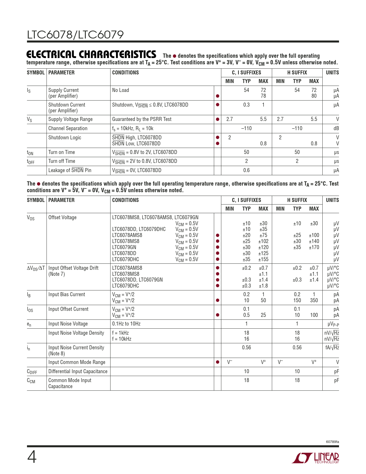 VOS Offset Voltage LTC6078MS8, LTC6078AMS8, LTC6079GN VCM = 0.5V ±10 ±30 ±10 ±30 μV LTC6078DD, LTC6079DHC VCM = 0.5V ±10 ±35 μV LTC6078AMS8 VCM = 0.5V ● ±20 ±75 ±25 ±100 μV LTC6078MS8 VCM = 0.5V ● ±25 ±102 ±30 ±140 μV LTC6079GN VCM = 0.5V ● ±30 ±120 ±35 ±170 μV LTC6078DD VCM = 0.5V ● ±30 ±125 μV LTC6079DHC VCM = 0.5V ● ±35 ±155 μV ΔVOS ⁄ΔT Input Offset Voltage Drift LTC6078AMS8 ● ±0.2 ±0.7 ±0.2 ±0.7 μV/°C (Note 7) LTC6078MS8 ● ±1.1 ±1.1 μV/°C LTC6078DD, LTC6079GN ● ±0.3 ±1.4 ±0.3 ±1.4 μV/°C LTC6079DHC ● ±0.3 ±1.8 μV/°C IB Input Bias Current VCM = V+/2 0.2 1 0.2 1 pA VCM = V+/2 ● 10 50 150 350 pA IOS Input Offset Current VCM = V+/2 0.1 0.1 pA VCM = V+/2 ● 0.5 25 10 100 pA en Input Noise Voltage 0.1Hz to 10Hz 1 1 µVP-P Input Noise Voltage Density f = 1kHz 18 18 nV/√Hz f = 10kHz 16 16 nV/√Hz in Input Noise Current Density 0.56 0.56 fA/√Hz (Note 8) Input Common Mode Range ● V– V+ V– V+ V CDIFF Differential Input Capacitance 10 10 pF CCM Common Mode Input 18 18 pF Capacitance 60789fa 4