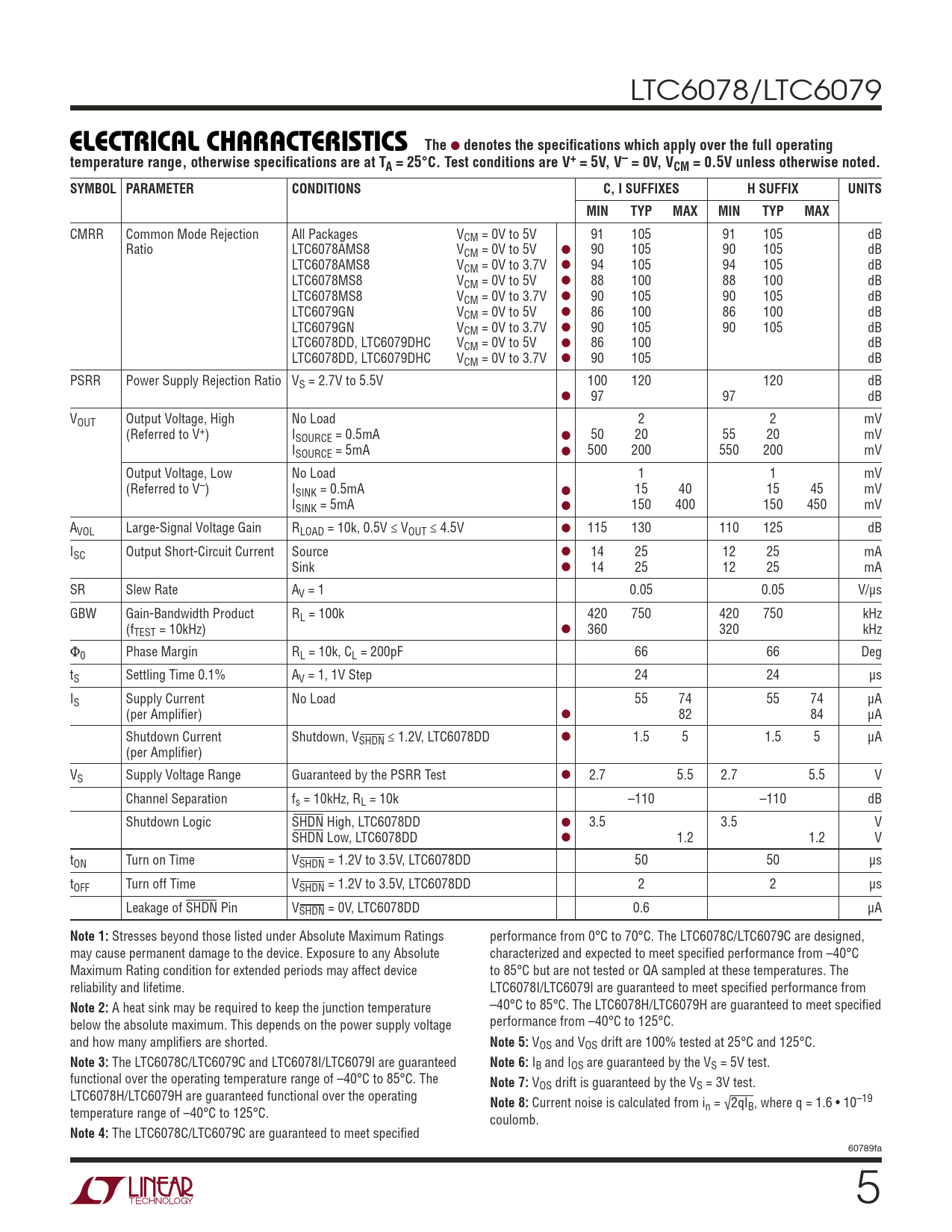 LTC6078/LTC6079 ELECTRICAL CHARACTERISTICSThe ● denotes the specifi cations which apply over the full operatingtemperature range, otherwise specifi cations are at TA = 25°C. Test conditions are V+ = 5V, V– = 0V, VCM = 0.5V unless otherwise noted.SYMBOL PARAMETERCONDITIONSC, I SUFFIXESH SUFFIXUNITSMINTYPMAXMINTYPMAX CMRR Common Mode Rejection All Packages VCM = 0V to 5V 91 105 91 105 dB Ratio LTC6078AMS8 VCM = 0V to 5V ● 90 105 90 105 dB LTC6078AMS8 VCM = 0V to 3.7V ● 94 105 94 105 dB LTC6078MS8 VCM = 0V to 5V ● 88 100 88 100 dB LTC6078MS8 VCM = 0V to 3.7V ● 90 105 90 105 dB LTC6079GN VCM = 0V to 5V ● 86 100 86 100 dB LTC6079GN VCM = 0V to 3.7V ● 90 105 90 105 dB LTC6078DD, LTC6079DHC VCM = 0V to 5V ● 86 100 dB LTC6078DD, LTC6079DHC VCM = 0V to 3.7V ● 90 105 dB PSRR Power Supply Rejection Ratio VS = 2.7V to 5.5V 100 120 120 dB ● 97 97 dB VOUT Output Voltage, High No Load 2 2 mV (Referred to V+) ISOURCE = 0.5mA ● 50 20 55 20 mV ISOURCE = 5mA ● 500 200 550 200 mV Output Voltage, Low No Load 1 1 mV (Referred to V–) ISINK = 0.5mA ● 15 40 15 45 mV ISINK = 5mA ● 150 400 150 450 mV AVOL Large-Signal Voltage Gain RLOAD = 10k, 0.5V ≤ VOUT ≤ 4.5V ● 115 130 110 125 dB ISC Output Short-Circuit Current Source ● 14 25 12 25 mA Sink ● 14 25 12 25 mA SR Slew Rate AV = 1 0.05 0.05 V/μs GBW Gain-Bandwidth Product RL = 100k 420 750 420 750 kHz (fTEST = 10kHz) ● 360 320 kHz Φ0 Phase Margin RL = 10k, CL = 200pF 66 66 Deg tS Settling Time 0.1% AV = 1, 1V Step 24 24 μs IS Supply Current No Load 55 74 55 74 μA (per Amplifi er) ● 82 84 μA Shutdown Current Shutdown, VSHDN ≤ 1.2V, LTC6078DD ● 1.5 5 1.5 5 μA (per Amplifi er) VS Supply Voltage Range Guaranteed by the PSRR Test ● 2.7 5.5 2.7 5.5 V Channel Separation fs = 10kHz, RL = 10k –110 –110 dB Shutdown Logic SHDN High, LTC6078DD ● 3.5 3.5 V SHDN Low, LTC6078DD ● 1.2 1.2 V tON Turn on Time VSHDN = 1.2V to 3.5V, LTC6078DD 50 50 µs tOFF Turn off Time VSHDN = 1.2V to 3.5V, LTC6078DD 2 2 µs Leakage of SHDN Pin VSHDN = 0V, LTC6078DD 0.6 μA Note 1: Stresses beyond those listed under Absolute Maximum Ratings performance from 0°C to 70°C. The LTC6078C/LTC6079C are designed, may cause permanent damage to the device. Exposure to any Absolute characterized and expected to meet specifi ed performance from –40°C Maximum Rating condition for extended periods may affect device to 85°C but are not tested or QA sampled at these temperatures. The reliability and lifetime. LTC6078I/LTC6079I are guaranteed to meet specifi ed performance from Note 2: A heat sink may be required to keep the junction temperature –40°C to 85°C. The LTC6078H/LTC6079H are guaranteed to meet specifi ed below the absolute maximum. This depends on the power supply voltage performance from –40°C to 125°C. and how many amplifi ers are shorted. Note 5: VOS and VOS drift are 100% tested at 25°C and 125°C. Note 3: The LTC6078C/LTC6079C and LTC6078I/LTC6079I are guaranteed Note 6: IB and IOS are guaranteed by the VS = 5V test. functional over the operating temperature range of –40°C to 85°C. The Note 7: VOS drift is guaranteed by the VS = 3V test. LTC6078H/LTC6079H are guaranteed functional over the operating Note 8: Current noise is calculated from in = √2qIB, where q = 1.6 • 10–19 temperature range of –40°C to 125°C. coulomb. Note 4: The LTC6078C/LTC6079C are guaranteed to meet specifi ed 60789fa 5