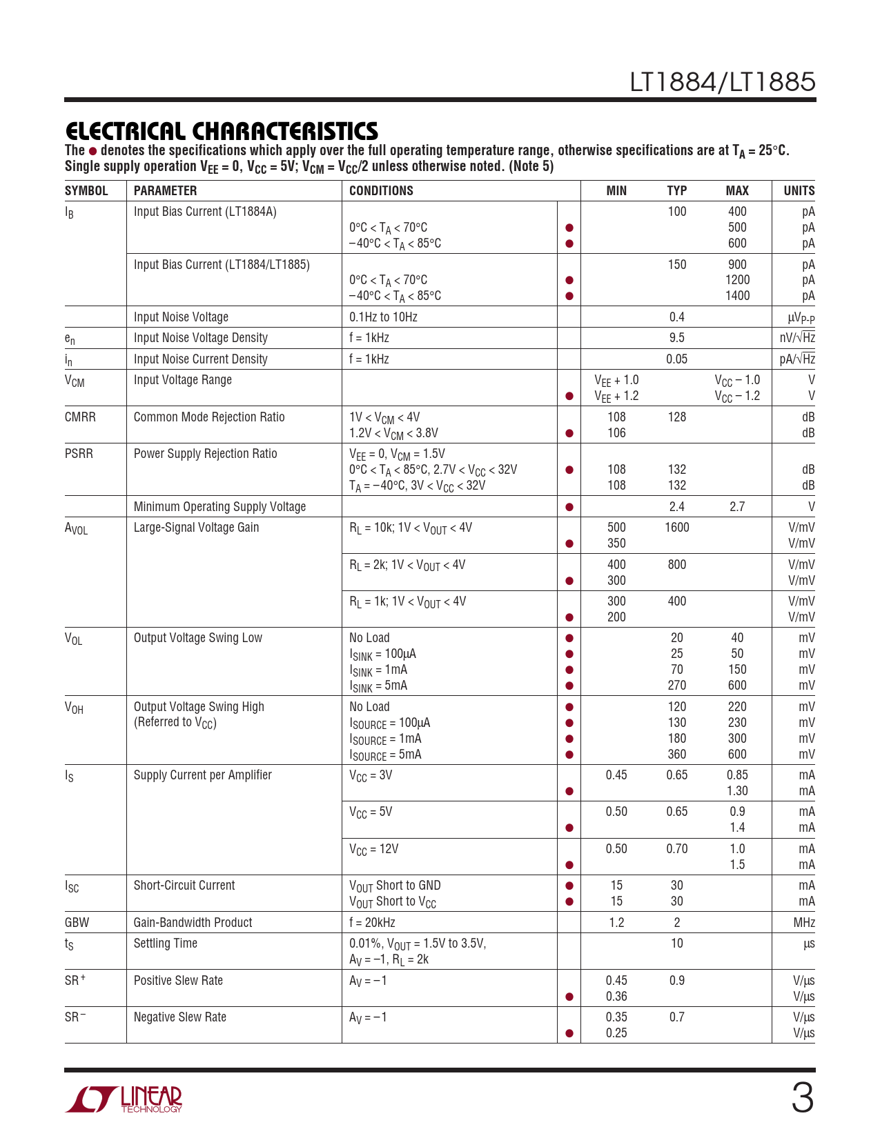 IB Input Bias Current (LT1884A) 100 400 pA 0°C < TA < 70°C ● 500 pA – 40°C < TA < 85°C ● 600 pA Input Bias Current (LT1884/LT1885) 150 900 pA 0°C < TA < 70°C ● 1200 pA – 40°C < TA < 85°C ● 1400 pA Input Noise Voltage 0.1Hz to 10Hz 0.4 µVP-P en Input Noise Voltage Density f = 1kHz 9.5 nV/√Hz in Input Noise Current Density f = 1kHz 0.05 pA/√Hz VCM Input Voltage Range VEE + 1.0 VCC – 1.0 V ● VEE + 1.2 VCC – 1.2 V CMRR Common Mode Rejection Ratio 1V < VCM < 4V 108 128 dB 1.2V < VCM < 3.8V ● 106 dB PSRR Power Supply Rejection Ratio VEE = 0, VCM = 1.5V 0°C < TA < 85°C, 2.7V < VCC < 32V ● 108 132 dB TA = – 40°C, 3V < VCC < 32V 108 132 dB Minimum Operating Supply Voltage ● 2.4 2.7 V AVOL Large-Signal Voltage Gain RL = 10k; 1V < VOUT < 4V 500 1600 V/mV ● 350 V/mV RL = 2k; 1V < VOUT < 4V 400 800 V/mV ● 300 V/mV RL = 1k; 1V < VOUT < 4V 300 400 V/mV ● 200 V/mV VOL Output Voltage Swing Low No Load ● 20 40 mV ISINK = 100µA ● 25 50 mV ISINK = 1mA ● 70 150 mV ISINK = 5mA ● 270 600 mV VOH Output Voltage Swing High No Load ● 120 220 mV (Referred to VCC) ISOURCE = 100µA ● 130 230 mV ISOURCE = 1mA ● 180 300 mV ISOURCE = 5mA ● 360 600 mV IS Supply Current per Amplifier VCC = 3V 0.45 0.65 0.85 mA ● 1.30 mA VCC = 5V 0.50 0.65 0.9 mA ● 1.4 mA VCC = 12V 0.50 0.70 1.0 mA ● 1.5 mA ISC Short-Circuit Current VOUT Short to GND ● 15 30 mA VOUT Short to VCC ● 15 30 mA GBW Gain-Bandwidth Product f = 20kHz 1.2 2 MHz tS Settling Time 0.01%, VOUT = 1.5V to 3.5V, 10 µs AV = –1, RL = 2k SR + Positive Slew Rate AV = – 1 0.45 0.9 V/µs ● 0.36 V/µs SR – Negative Slew Rate AV = – 1 0.35 0.7 V/µs ● 0.25 V/µs 3